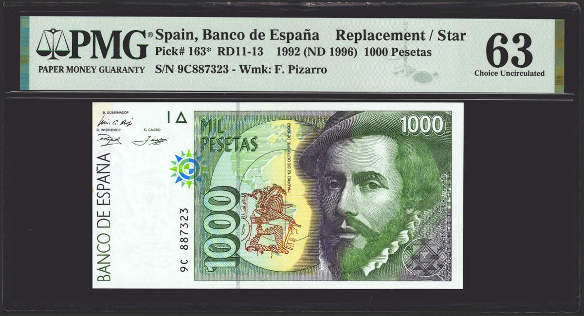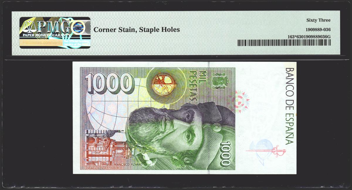 1000 Pesetas. 12 de Octubre de 1992. Serie especial 9C. (Edifil 2021: 483d, Pick: 163*). Manchita del tiempo en la esquina superior izquierda . SC-. Encapsulado PMG63 (corner stain, staple holes).