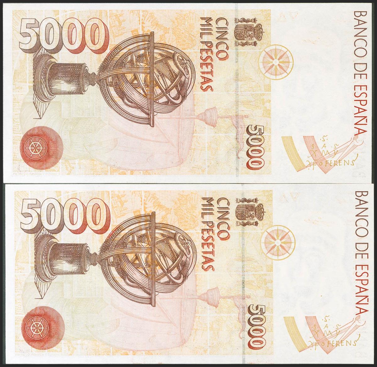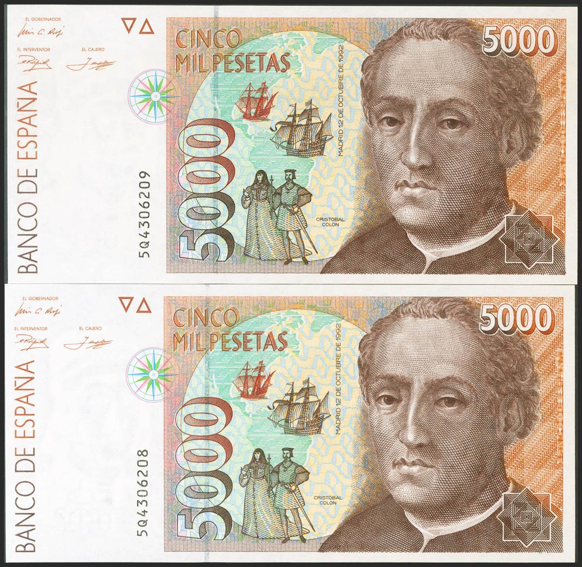 5000 Pesetas. 12 de Octubre de 1992. Pareja correlativa. Serie 5Q. (Edifil 2021: 484a). SC.