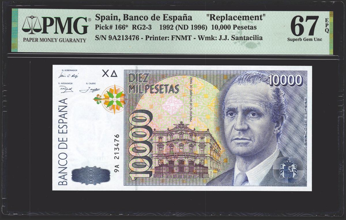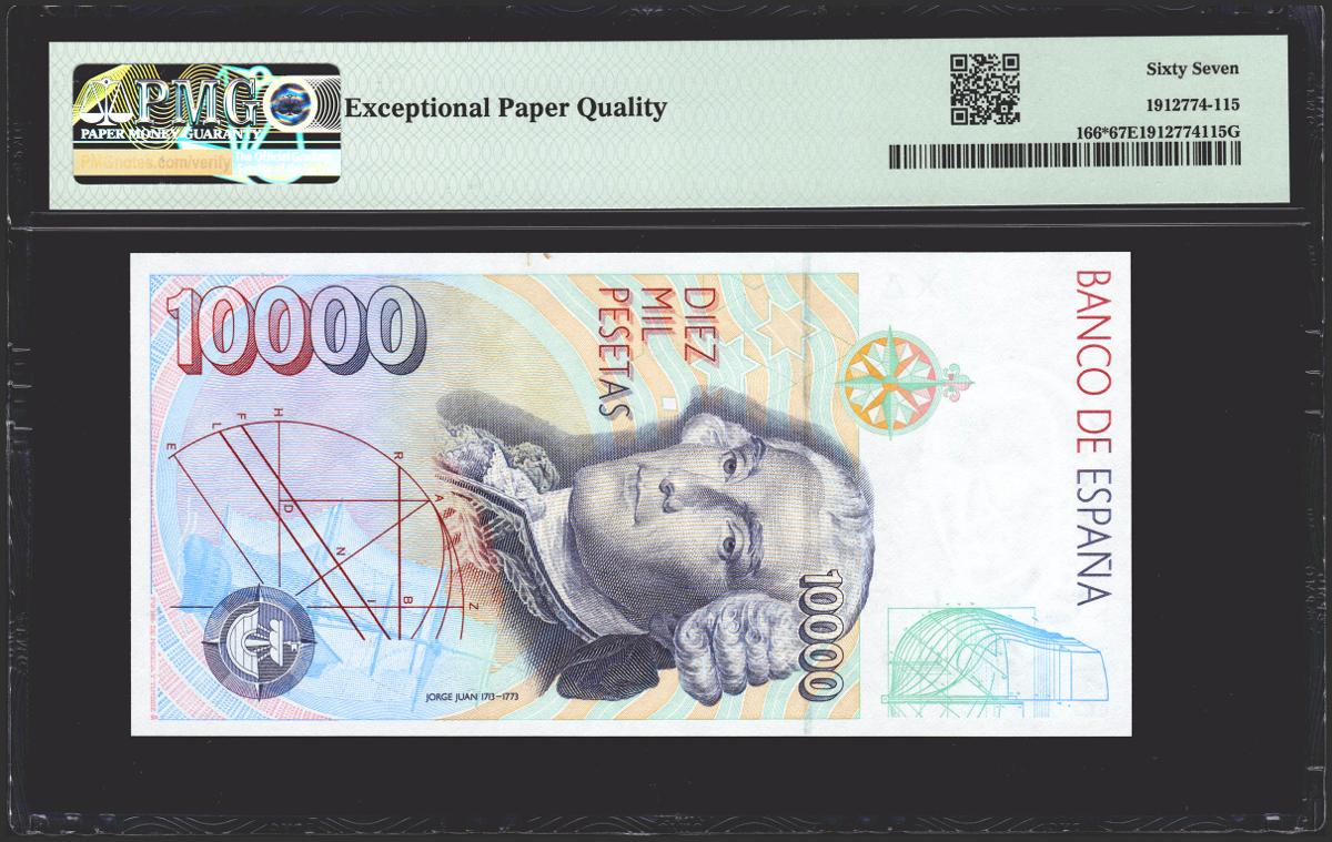 10000 Pesetas. 12 de Octubre de 1992. Serie especial 9A. (Edifil 2021: 485b, Pick: 166*). Raro en esta excepcional calidad. SC. Encapsulado PMG67EPQ.