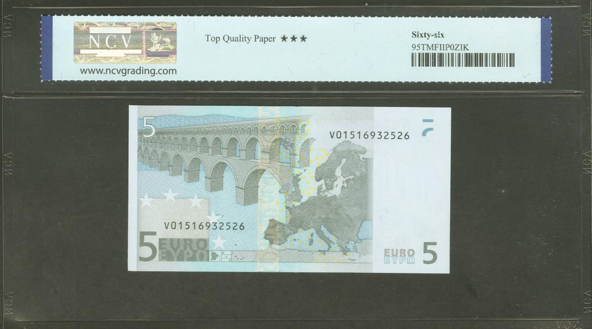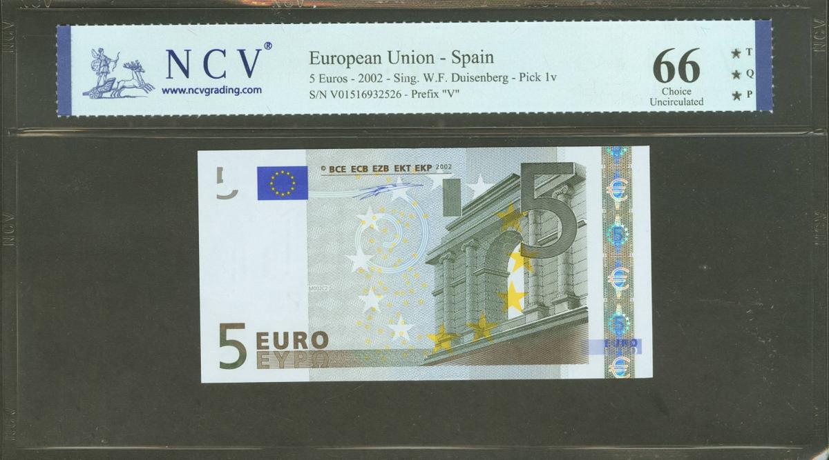 5 Euros. 1 de Enero de 2002. Firma Duisemberg. Serie V (España). (Edifil 2021: 486, Pick: 1v). SC. Encapsulado NCV66TQP.