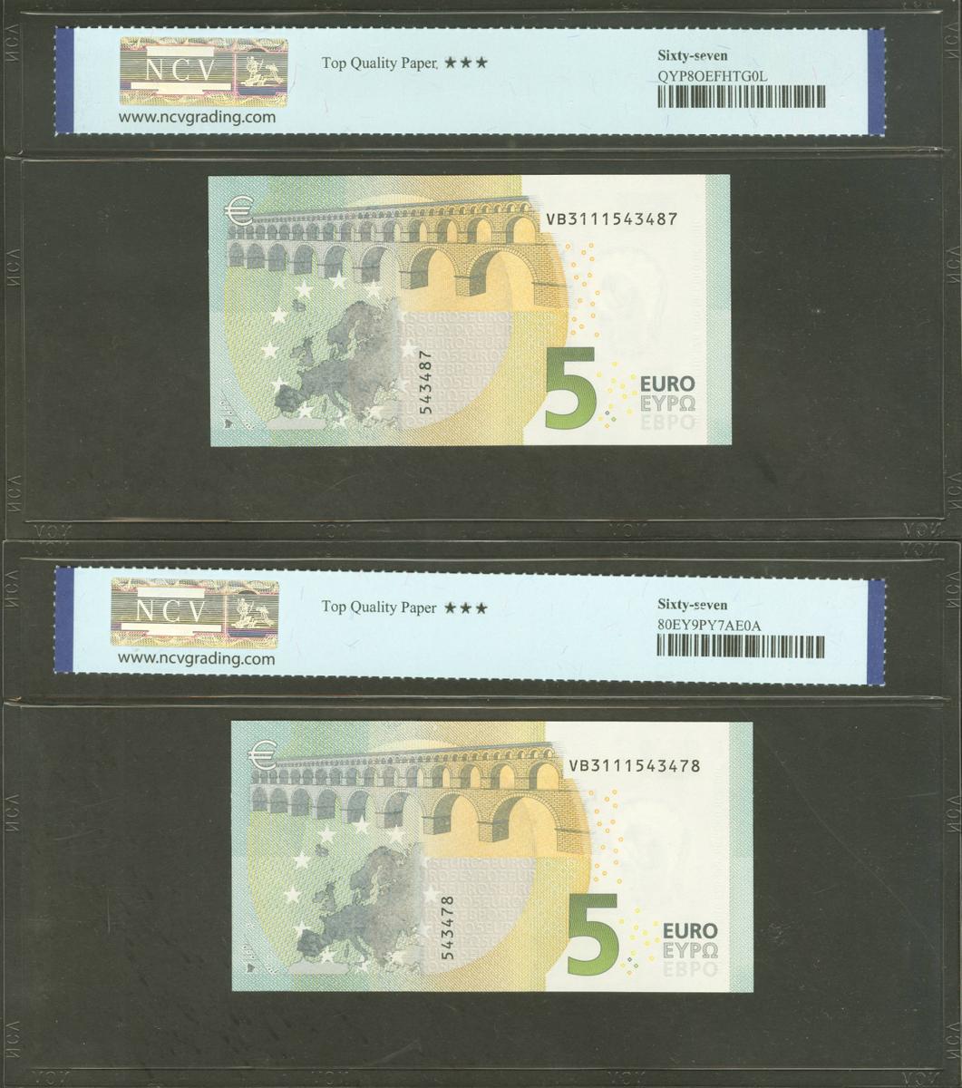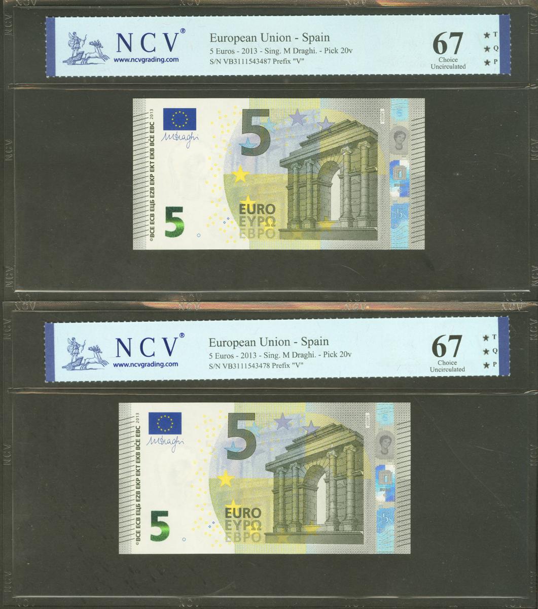 5 Euros. 2 de Mayo de 2013. Pareja correlativa (cabe recordar que el último dígito de la numeración de todos los billetes denominados en euros es para control interno del Banco Central Europeo, el que marca la correlatividad de los billetes es el penúltimo dígito). Firma Draghi. Serie V (España). (Edifil 2021: 493, Pick: 20v). SC. Encapsulados NCV67TQP.