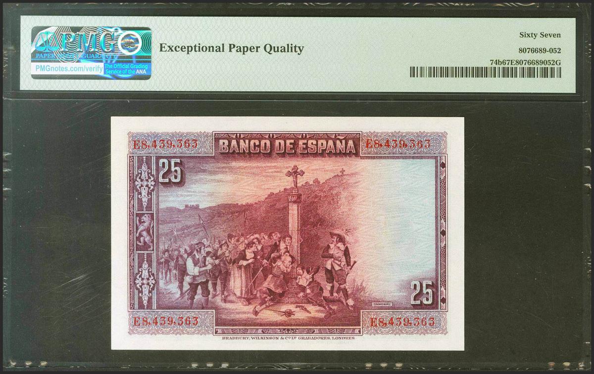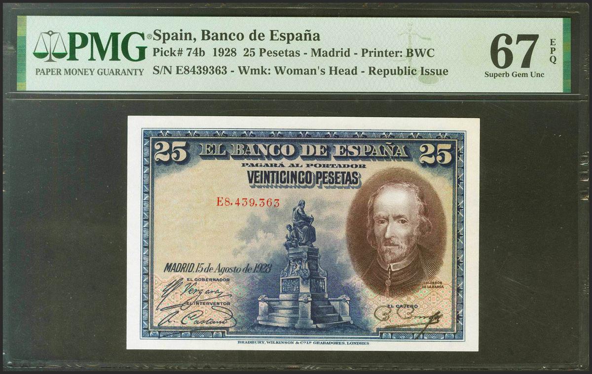 25 Pesetas. 15 de Agosto de 1928. Serie E. (Edifil 2021: 353, Pick: 74b). Raro en esta excepcional calidad, apresto original. SC. Encapsulado PMG67EPQ.