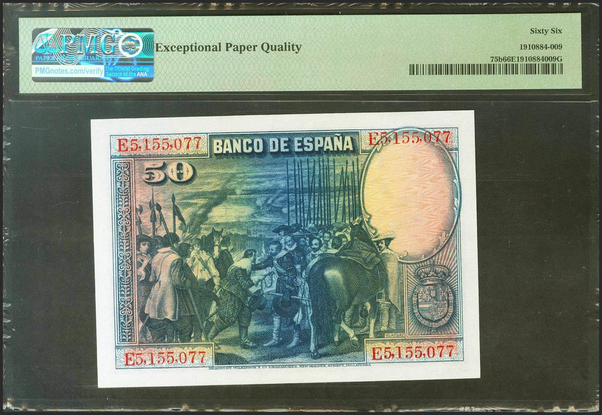 50 Pesetas. 15 de Agosto de 1928. Serie E, última serie emitida. (Edifil 2021: 354, Pick: 75b). Inusual en esta excepcional calidad, apresto original. SC. Encapsulado PMG66EPQ.