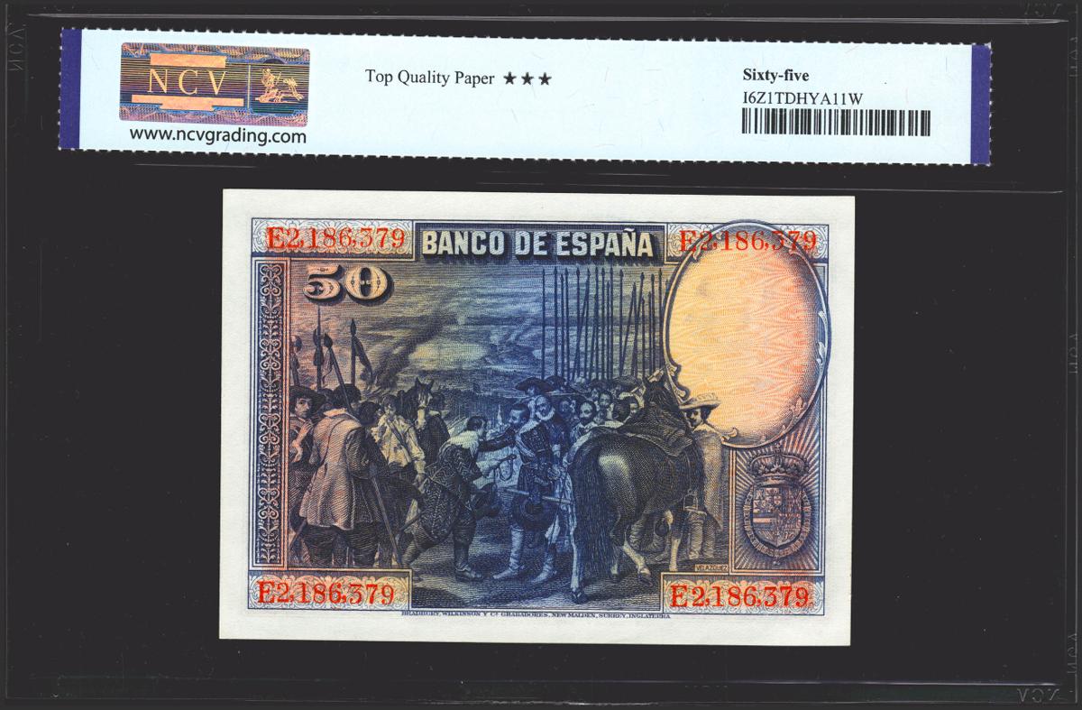 50 Pesetas. 15 de Agosto de 1928. Serie E. (Edifil 2021: 354, Pick: 75b). Apresto original. SC. Encapsulado NCV65TQP.