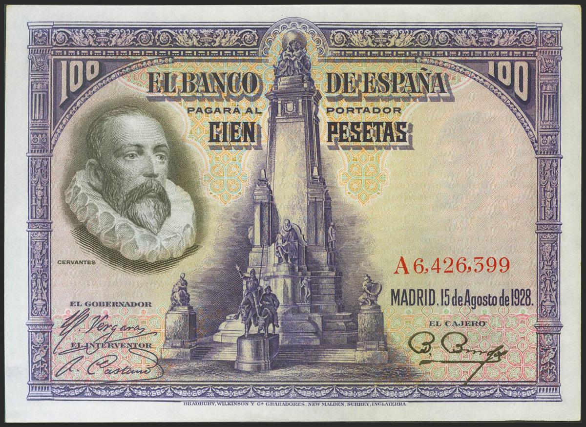 100 Pesetas. 15 de Agosto de 1928. Serie A. (Edifil 2021: 355a). Apresto original. SC.