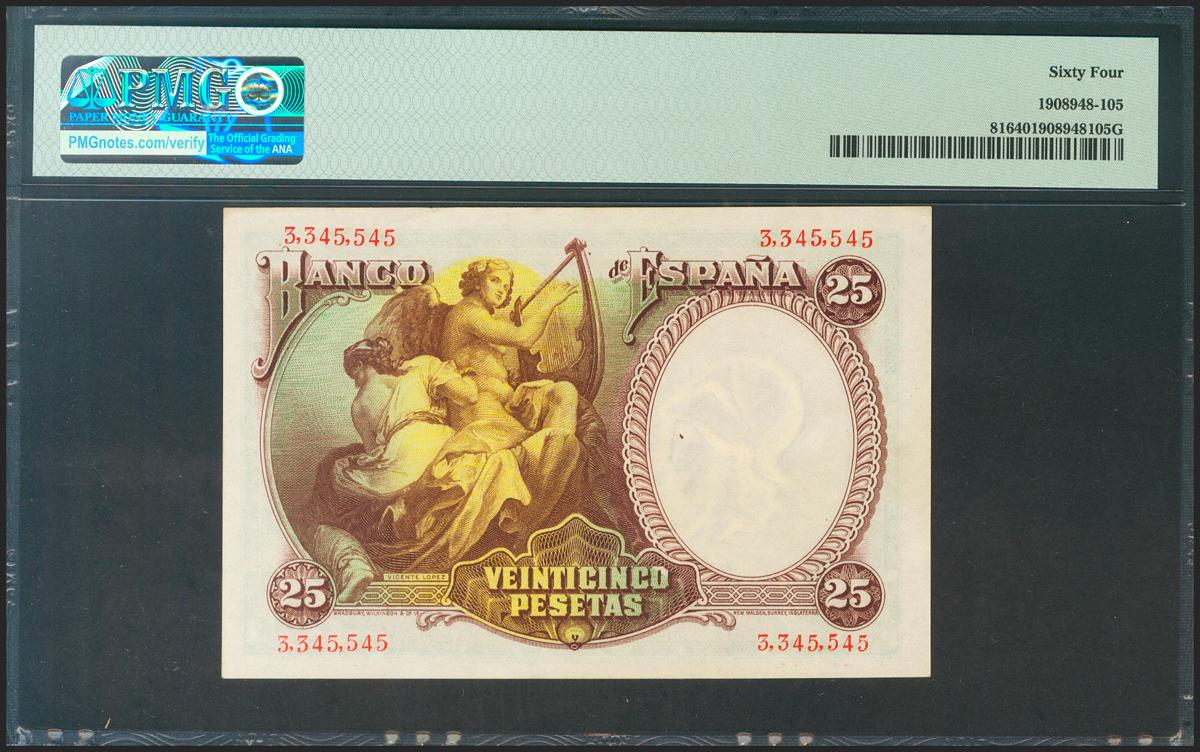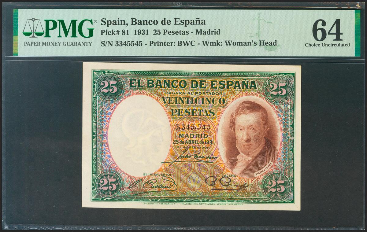 25 Pesetas. 25 de Abril de 1931. Sin serie. (Edifil 2021: 358, Pick: 81). Inusual en esta calidad. SC. Encapsulado PMG64.