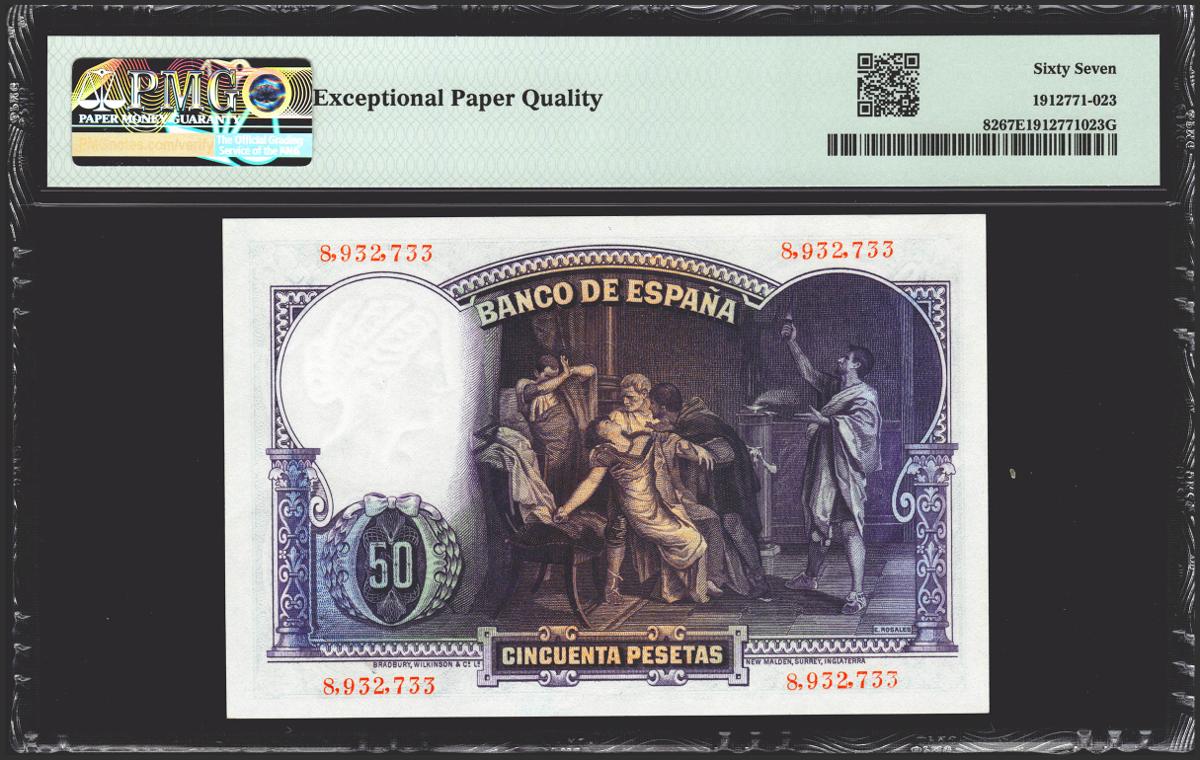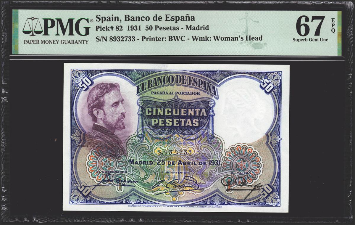 50 Pesetas. 25 de Abril de 1931. Sin serie. (Edifil 2021: 359, Pick: 82). Rara en esta excepcional calidad, apresto original. SC. Encapsulado PMG67EPQ.