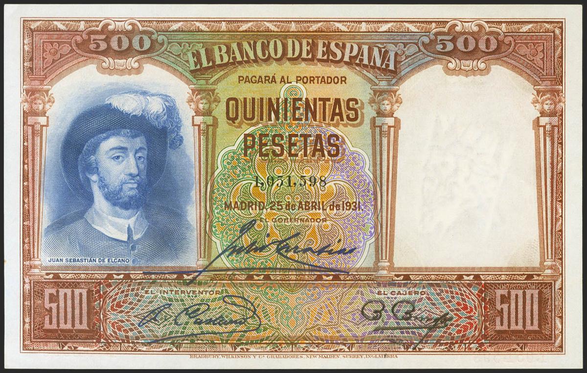 500 Pesetas. 25 de Abril de 1931. Sin serie. (Edifil 2021: 361). Conserva todo el apresto original. SC-.