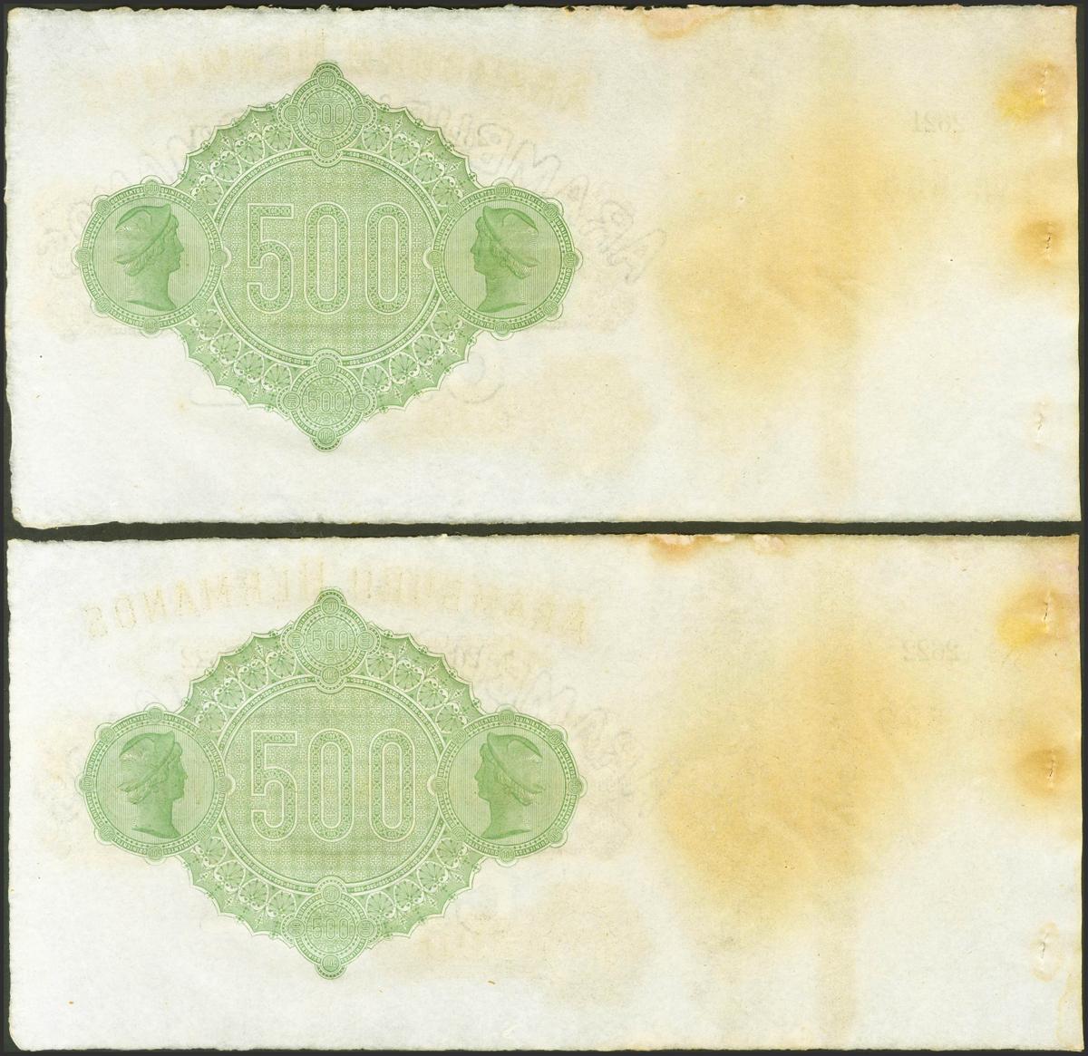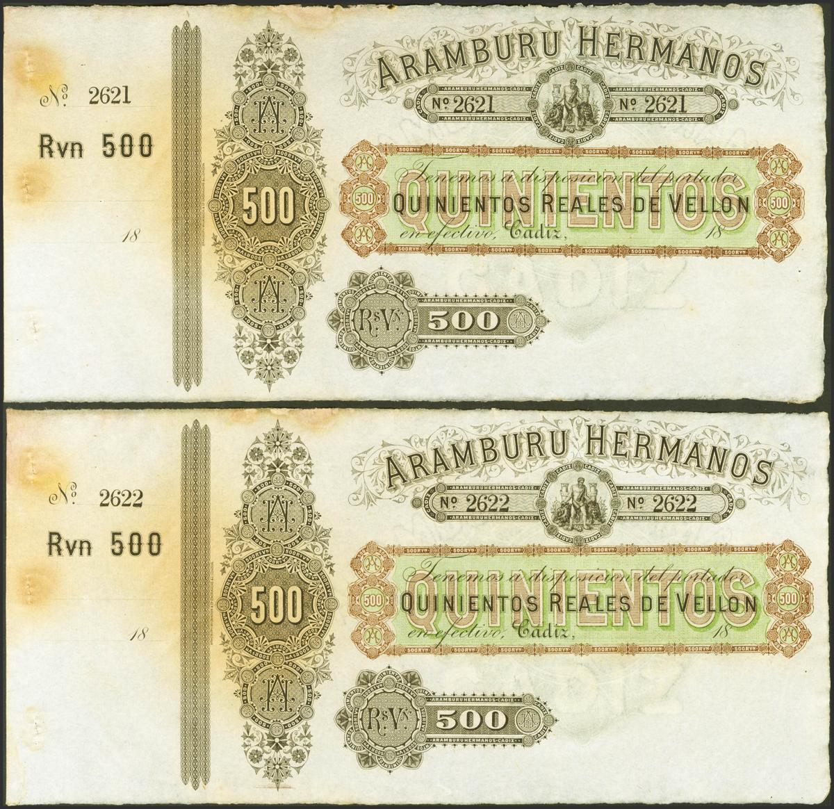 500 Reales de Vellón. (18__ca). Pareja correlativa. Aramburu Hermanos, Cádiz (matriz a la izquierda)(manchas del tiempo). Para entender mejor la contextualización de este billete recomendamos la obra "Obligaciones, vales y documentos puestos en circulación como papel moneda en España", de Don Ramón Cobo Huici. SC--.