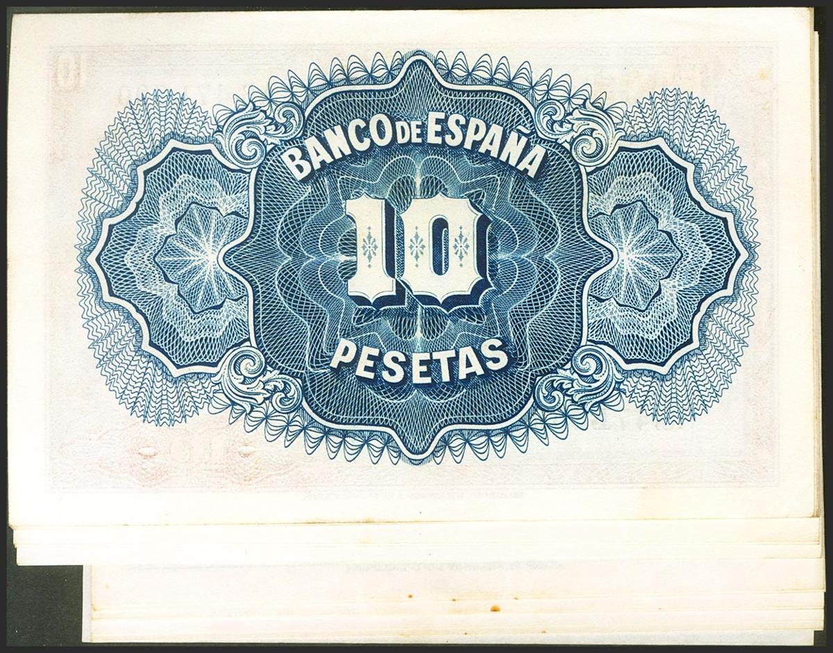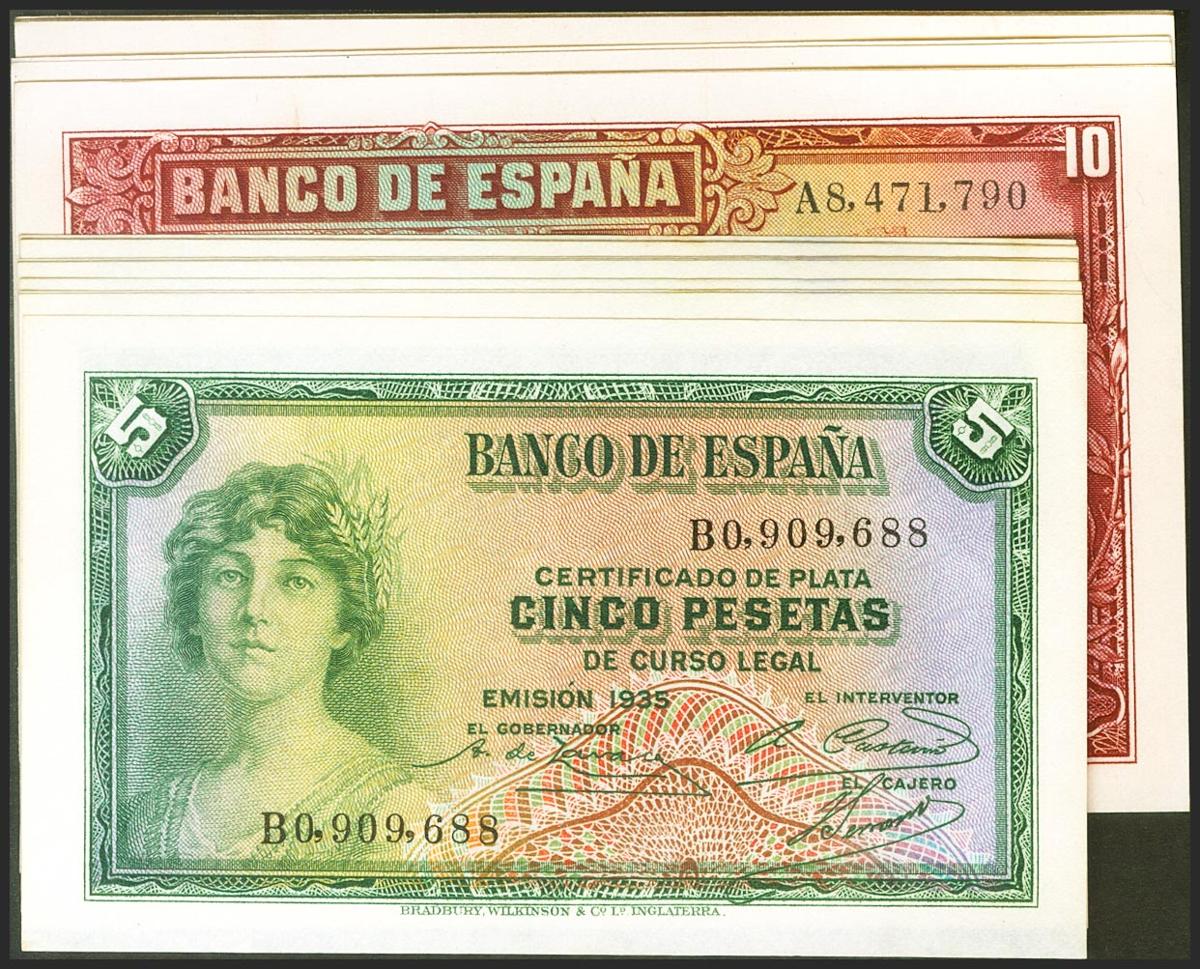 Conjunto de 10 billetes correlativos (a excepción del 10 Pesetas que hay un salto) de 5 Pesetas y 10 Pesetas Certificado de Plata emitidos en 1935 y ambos con las series B y A, respectivamente (Edifil 2021: 2021: 363a, 364a), conservando todo su apresto original. SC/SC-.
