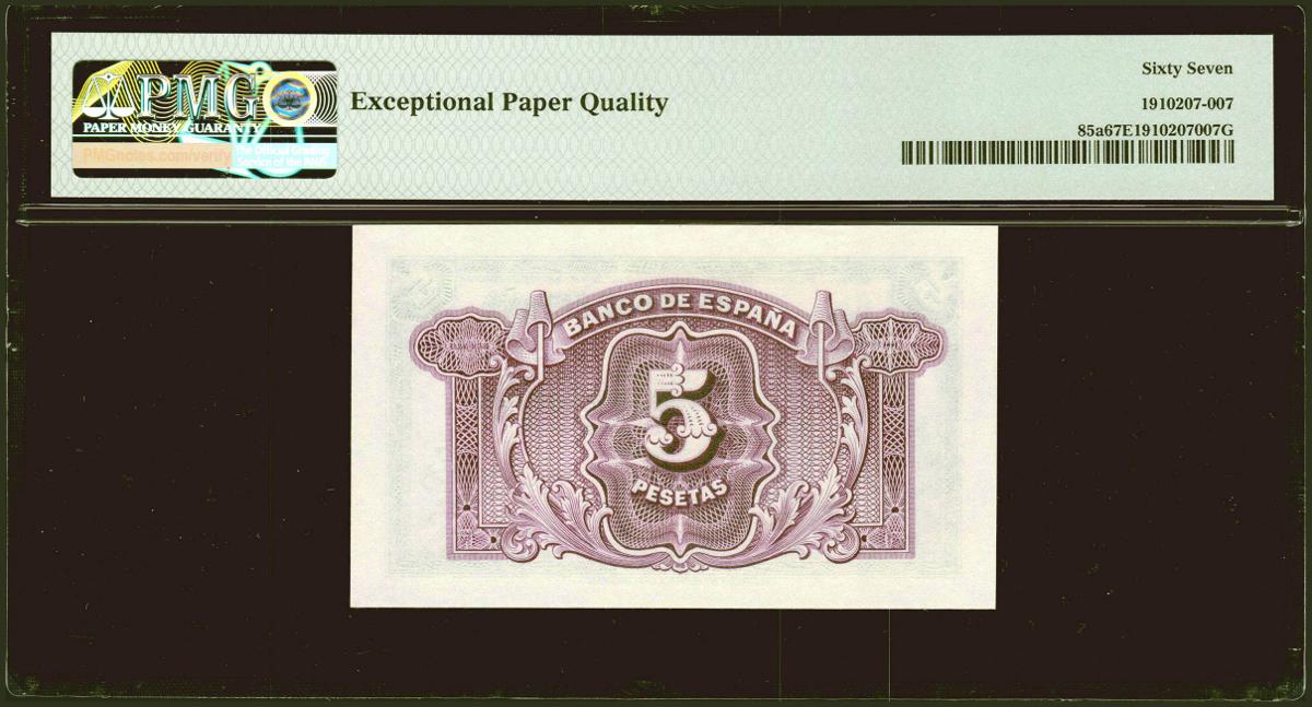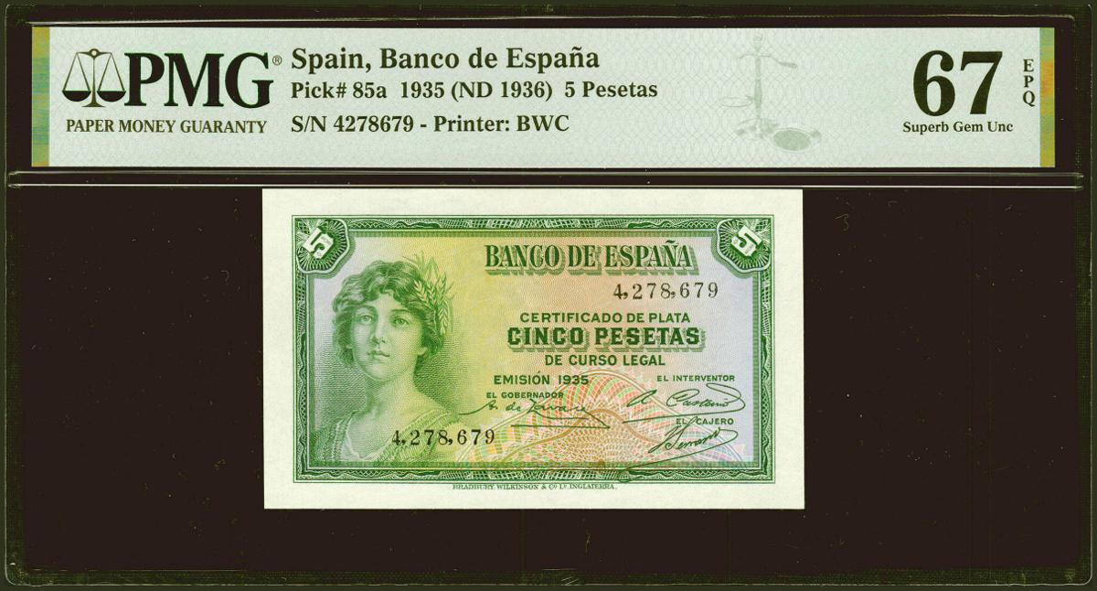 5 Pesetas. 1935. Certificado de Plata. Sin serie. (Edifil 2021: 363, Pick: 85a). Raro en esta excepcional calidad, apresto original. SC. Encapsulado PMG67EPQ