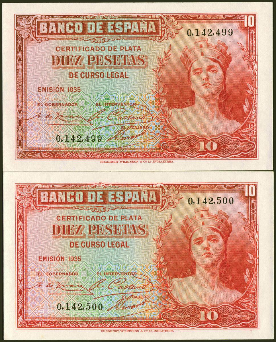 10 Pesetas. 1935. Certificado de Plata. Pareja correlativa. Sin serie. (Edifil 2017: 364). Conserva todo su apresto original. SC.