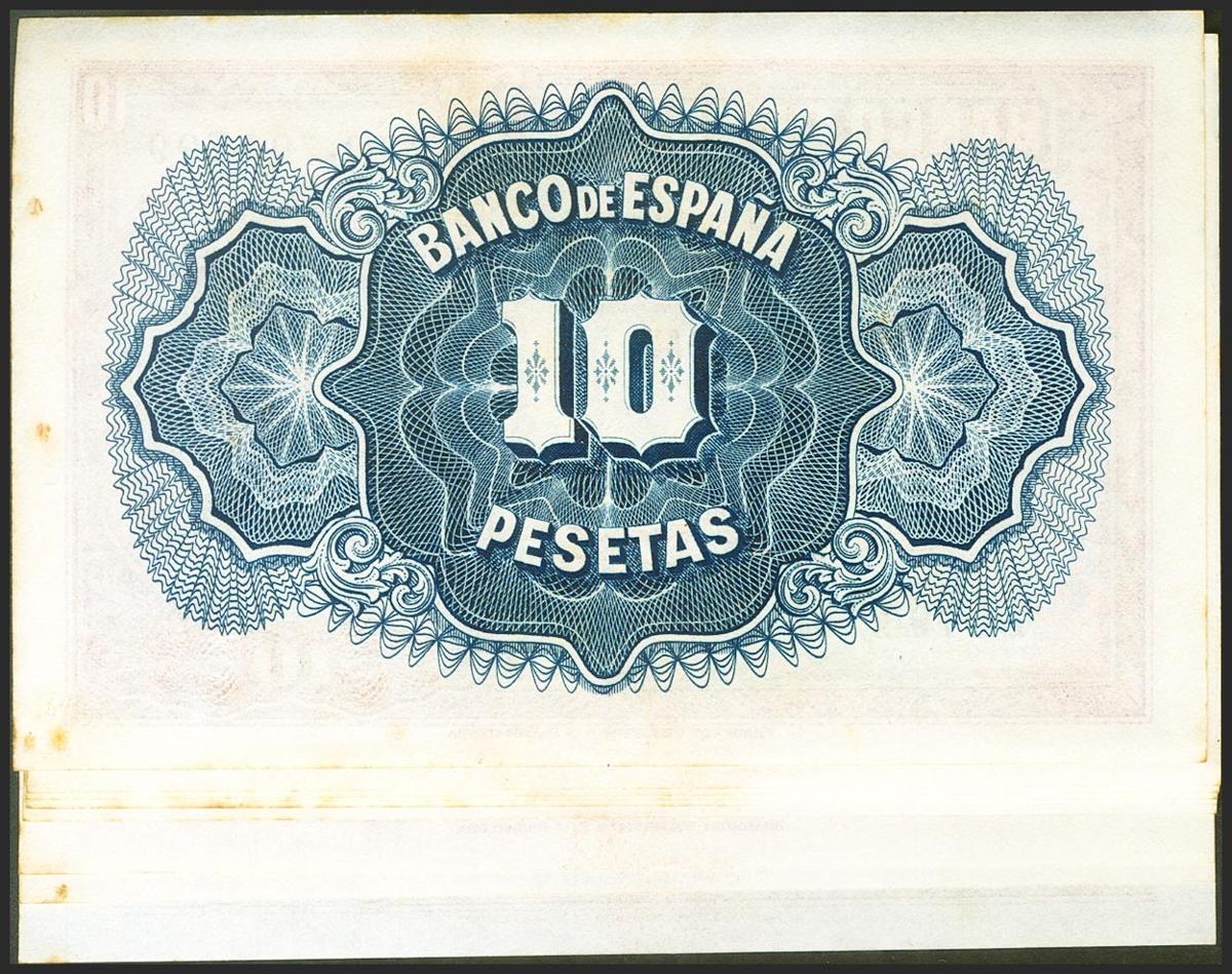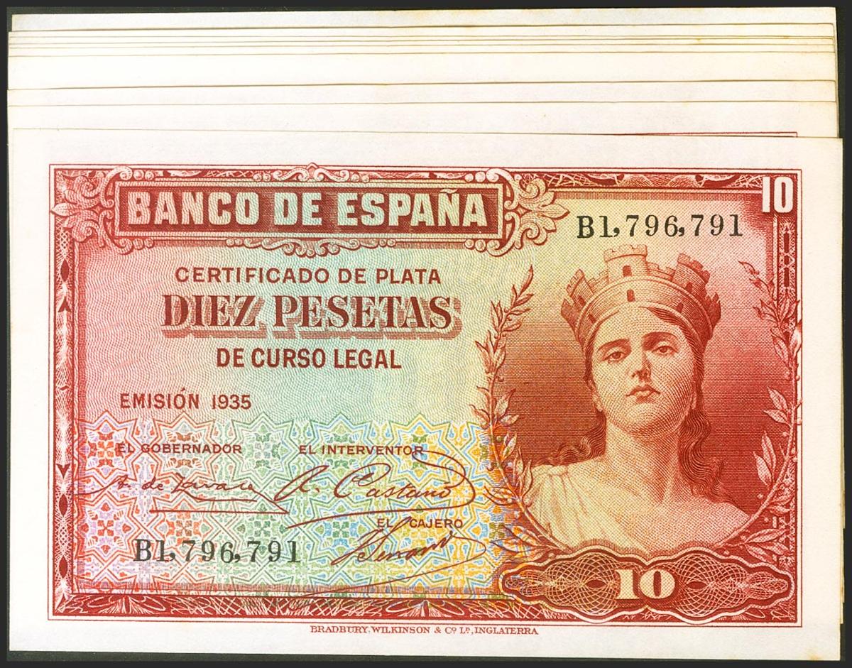 Conjunto de 9 billetes correlativos de 10 Pesetas Certificado de Plata emitidos en 1935 y con la serie B (Edifil 2021: 364a), algunos con manchitas y conservando todo su apresto original. SC/SC-.