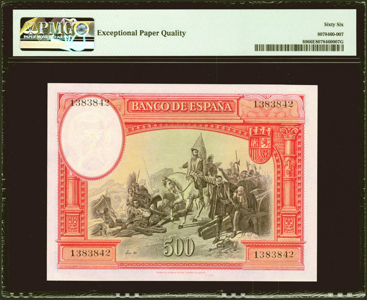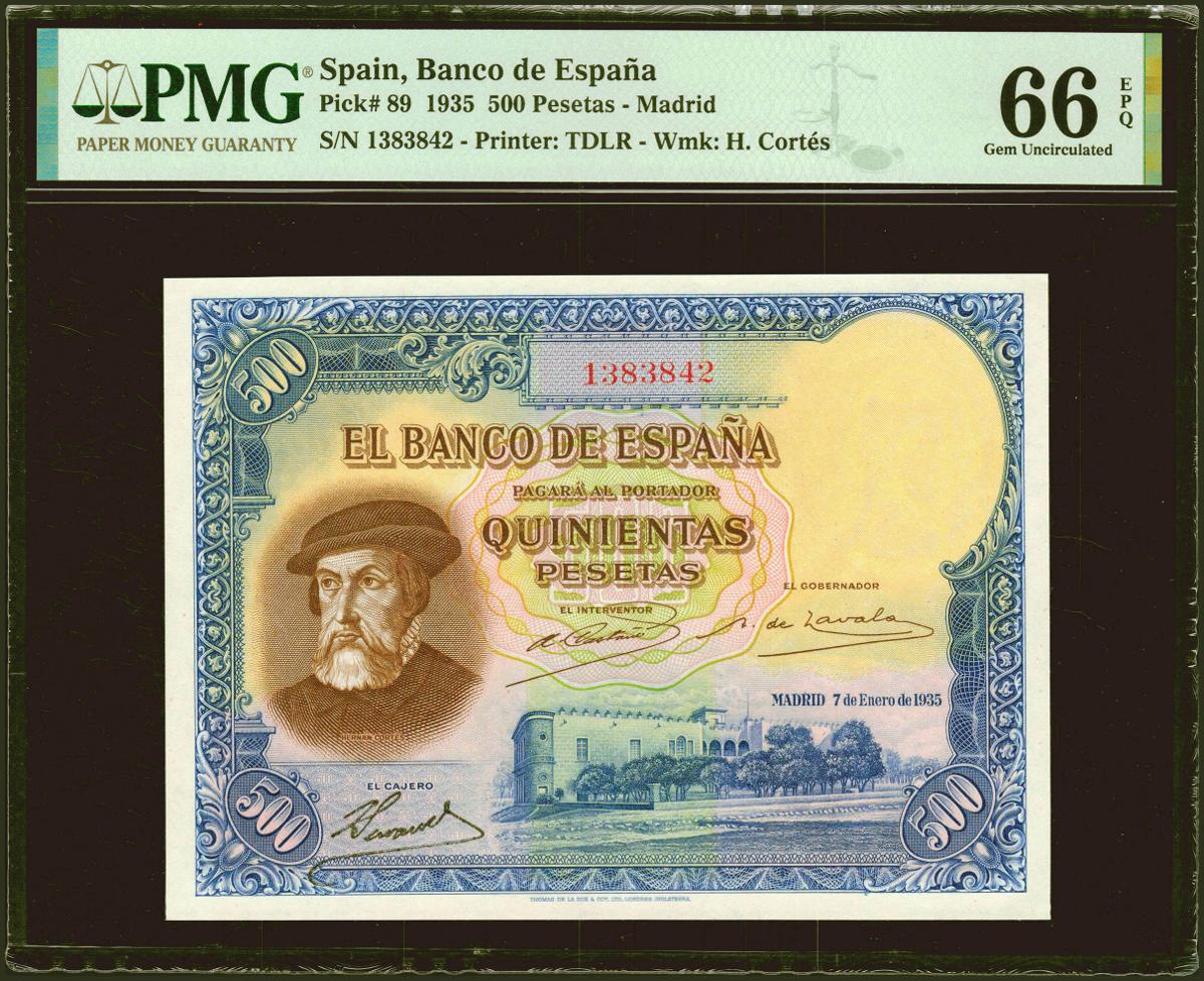 500 Pesetas. 7 de Enero de 1935. Sin serie. (Edifil 2021: 365, Pick: 89). Apresto original. SC. Encapsulado PMG66EPQ.
