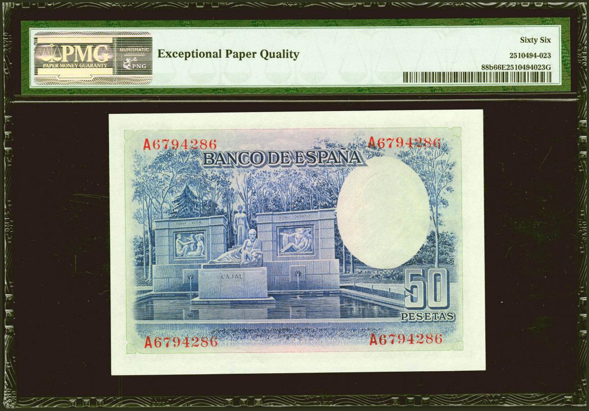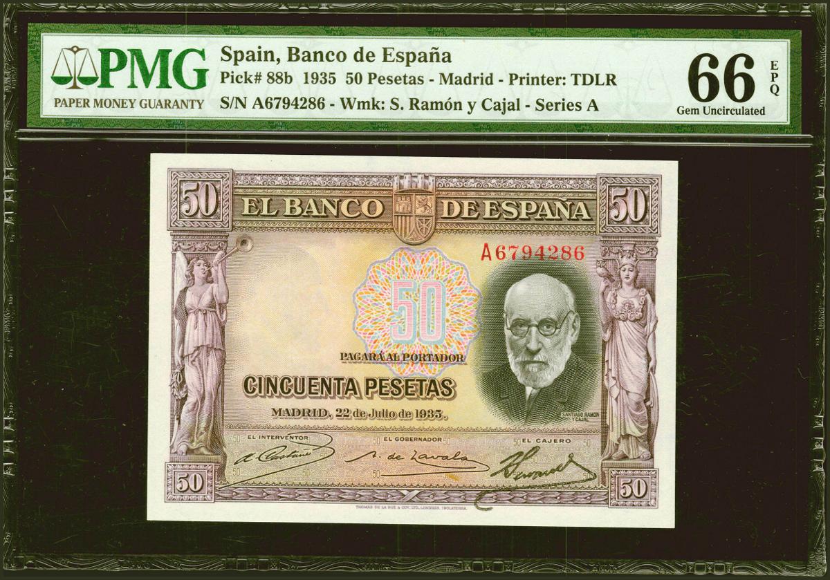 50 Pesetas. 22 de Julio de 1935. Serie A. (Edifil 2021: 366a, Pick: 88b). Apresto original. SC. Encapsulado PMG66EPQ.