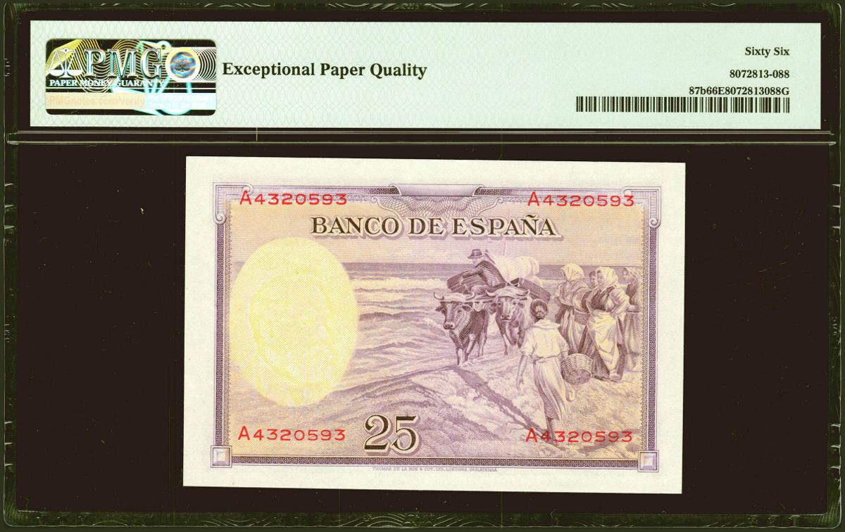 25 Pesetas. 31 de Agosto de 1936. Serie A. (Edifil 2021: 367a, Pick: 87b). Raro en esta excepcional calidad, apresto original. Encapsulado PMG66EPQ.
