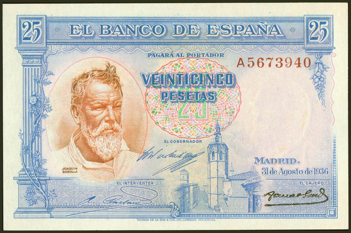 25 Pesetas. 31 de Agosto de 1936. Serie A. (Edifil 2021: 367a). Conserva todo su apresto original. SC.