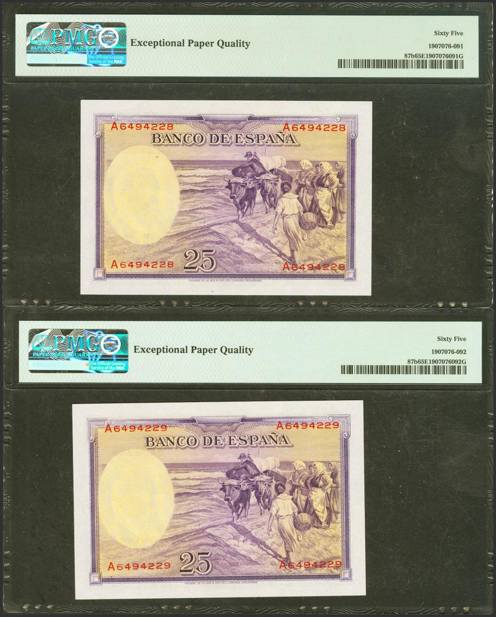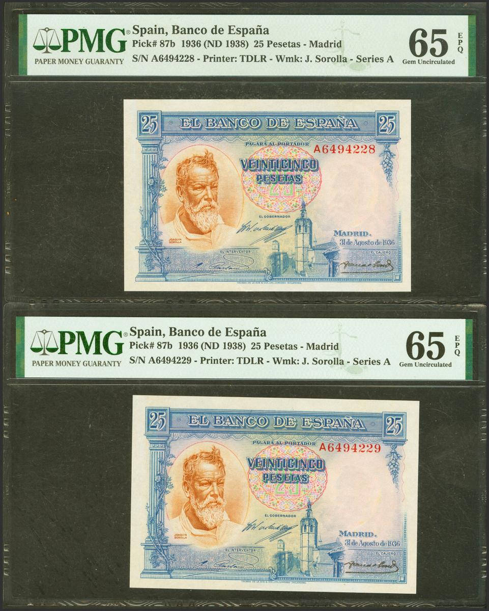 25 Pesetas. 31 de Agosto de 1936. Serie A. Pareja correlativa. (Edifil 2021: 367a, Pick: 87b). Apresto original. SC. Encapsulado PMG65EPQ, ambos.