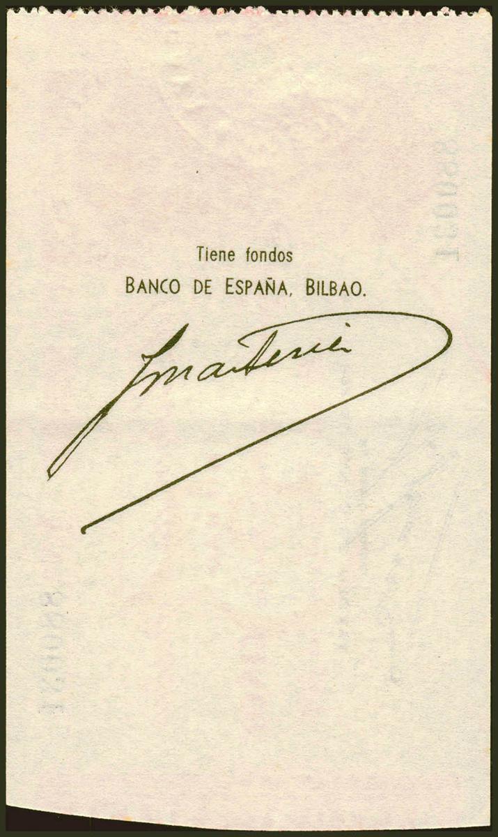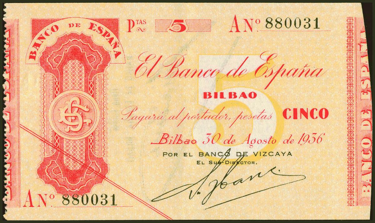 5 Pesetas. 30 de Agosto de 1936. Sucursal de Bilbao, antefirma del Banco de Vizcaya. Serie A. (Edifil 2021: 368Aa). Inusual, ligerísima ondulación que de ninguna manera rompe la fibra. EBC++.