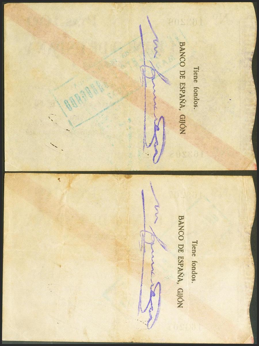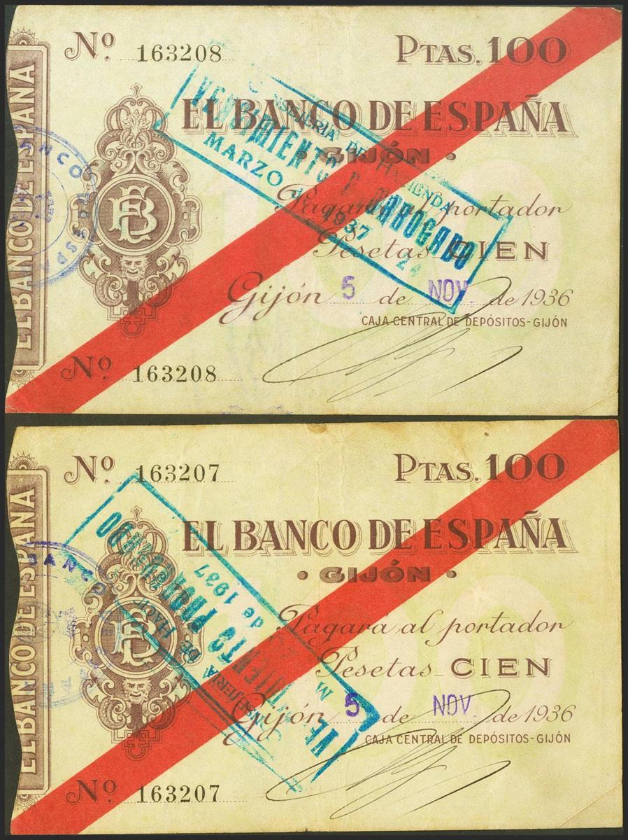 100 Pesetas. 5 de Noviembre de 1936. Sucursal de Gijón. Pareja correlativa. Sin serie. (Edifil 2021: 384). Rarísima pareja, especialmente en esta excepcional calidad para este billete, que siempre está en calidades bajas. EBC.
