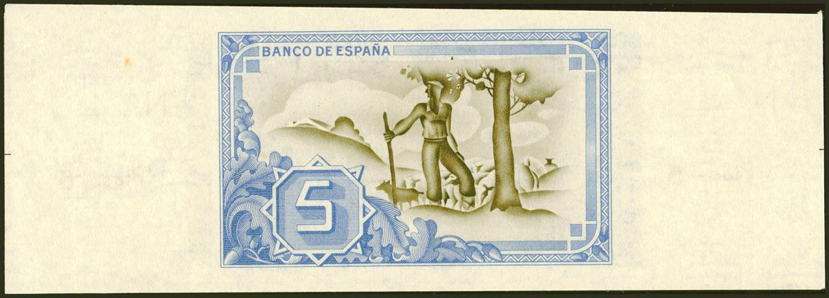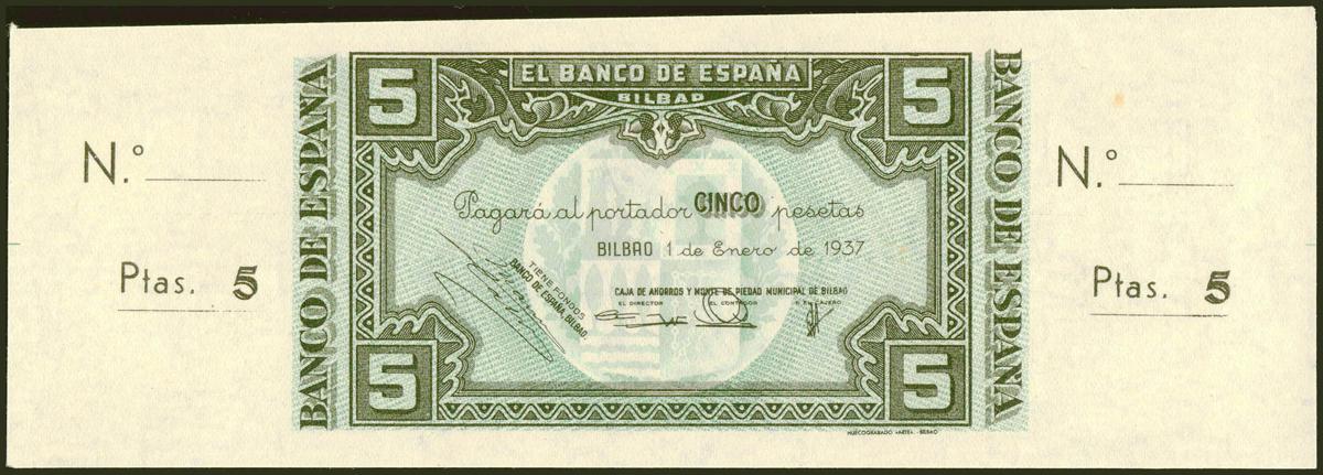 5 Pesetas. 1 de Enero de 1937. Sucursal de Bilbao, antefirma Caja de Ahorros y Monte de Piedad Municipal de Bilbao. Sin serie y sin numeración, con ambas matrices. (Edifil 2021: 385a). Apresto original, puntitos. SC-.