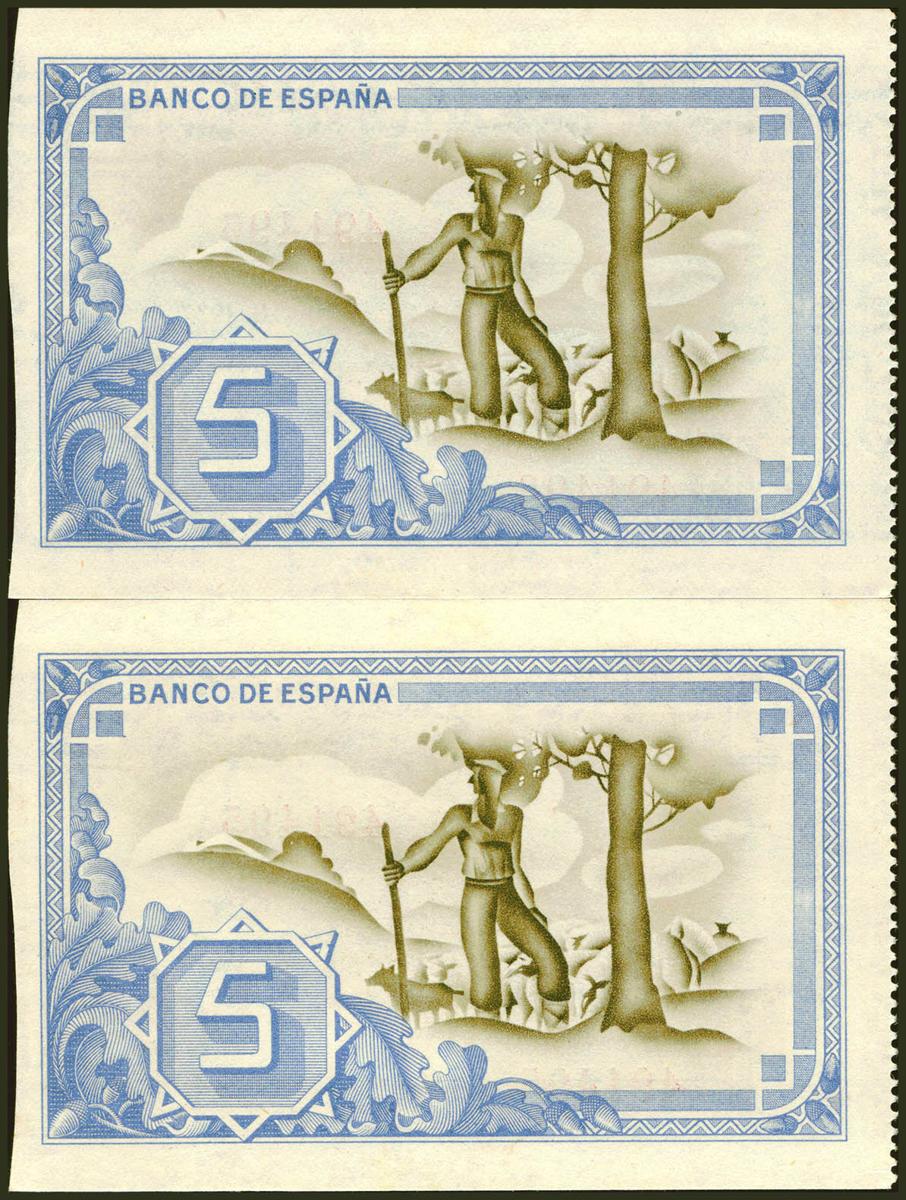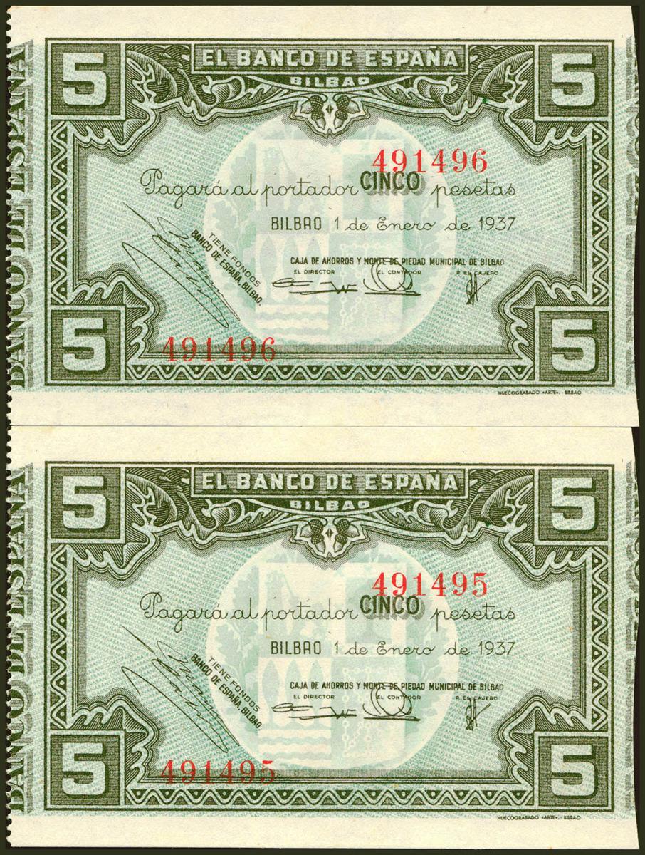 5 Pesetas. 1 de Enero de 1937. Pareja correlativa. Sucursal de Bilbao, antefirma Caja de Ahorros y Monte de Piedad Municipal de Bilbao. Con numeración y sin matrices. (Edifil 2021: 385a). Apresto original. SC.