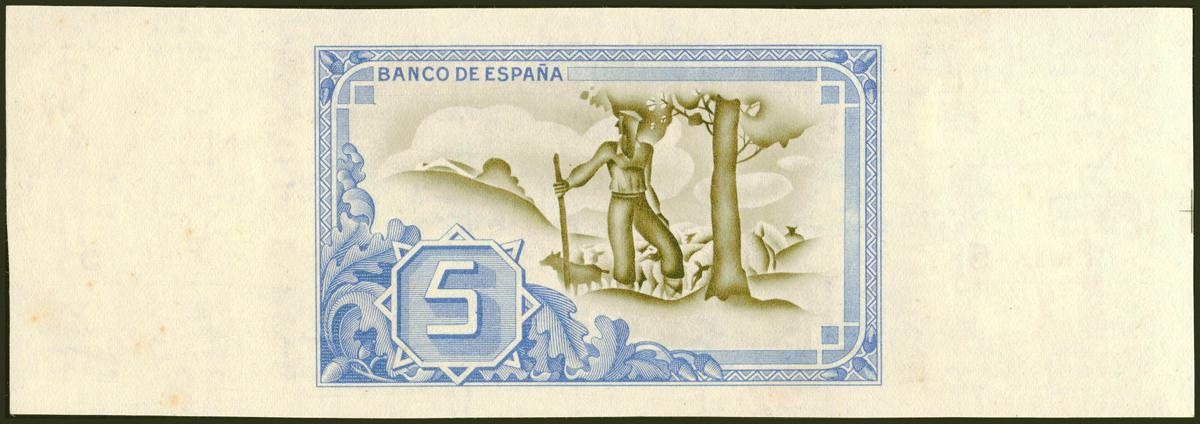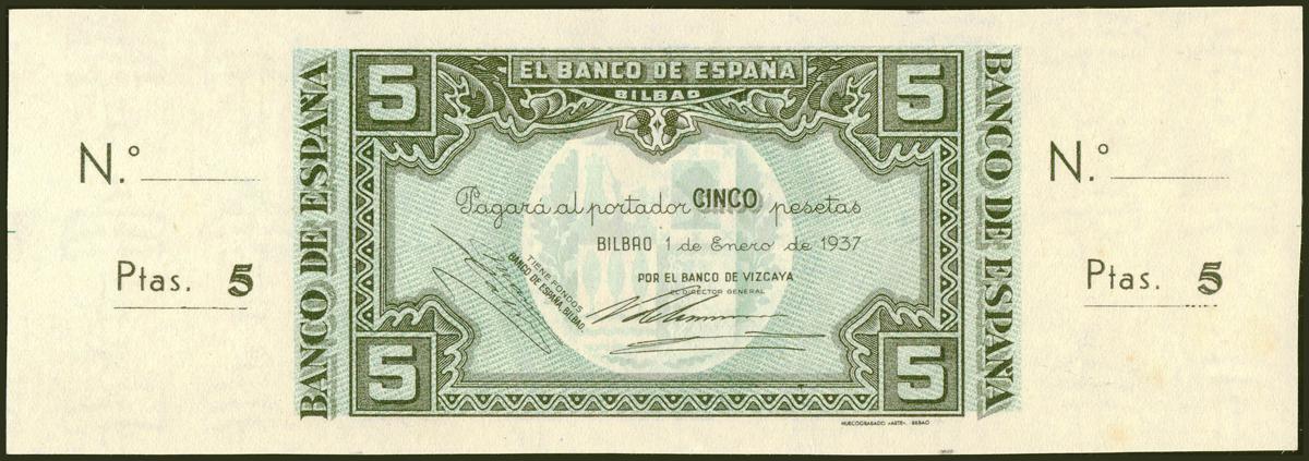 5 Pesetas. 1 de Enero de 1937. Sucursal de Bilbao, antefirma del Banco de Vizcaya. Sin serie y sin numeración, con ambas matrices. (Edifil 2021: 385f). Típicos puntitos del tiempo, apresto original. SC-.
