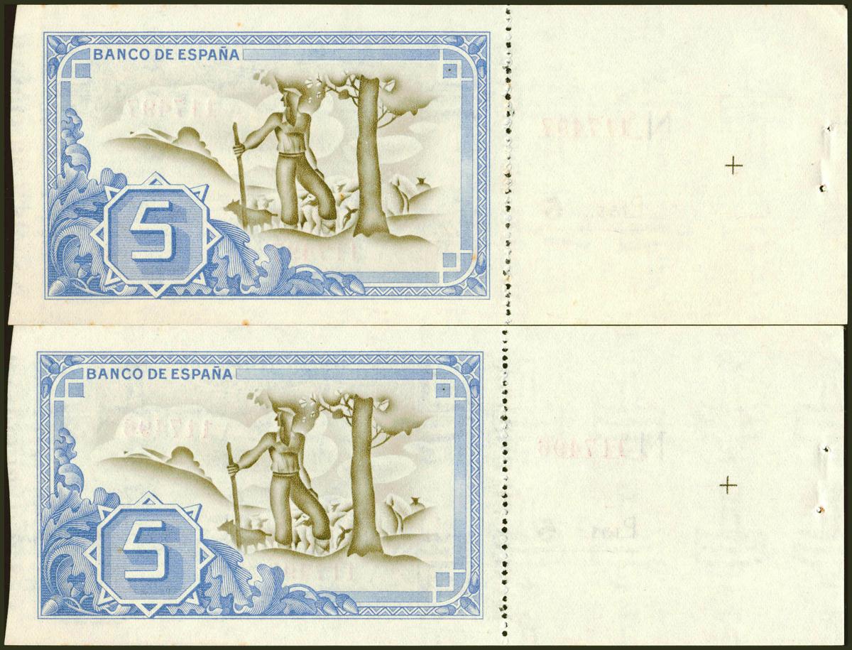 5 Pesetas. 1 de Enero de 1937. Pareja correlativa. Serie A y antefirma Banco Urquijo Vascongado, matriz a la izquierda. (Edifil 2021: 386f). Puntitos de grapa a la izquierda de la matriz sin importancia y puntitos del tiempo. SC-.