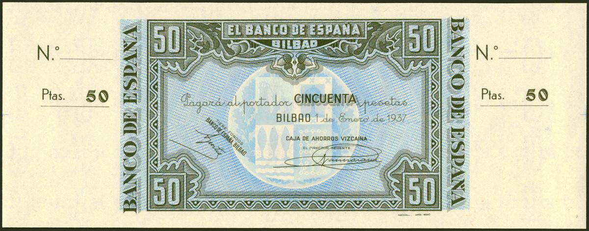 50 Pesetas. 1 de Enero de 1937. Sucursal de Bilbao, antefirma Banco Ahorros Vizcaína. Sin serie y sin numeración, con ambas matrices. (Edifil 2021: 389f). Apresto original. SC-.