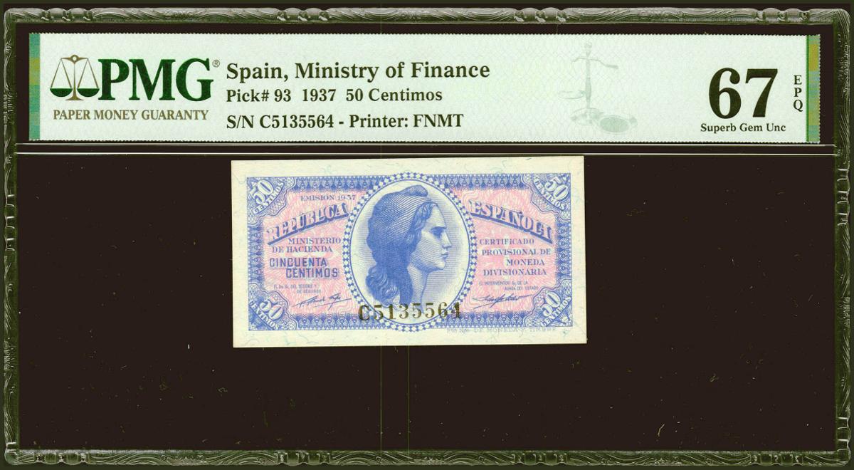 50 Céntimos. 1937. Ministerio de Hacienda. Serie C, última serie emitida. (Edifil 2021: 391a, Pick: 93). Raro en esta excepcional conservación, apresto original. SC. Encapsulado PMG67EPQ.
