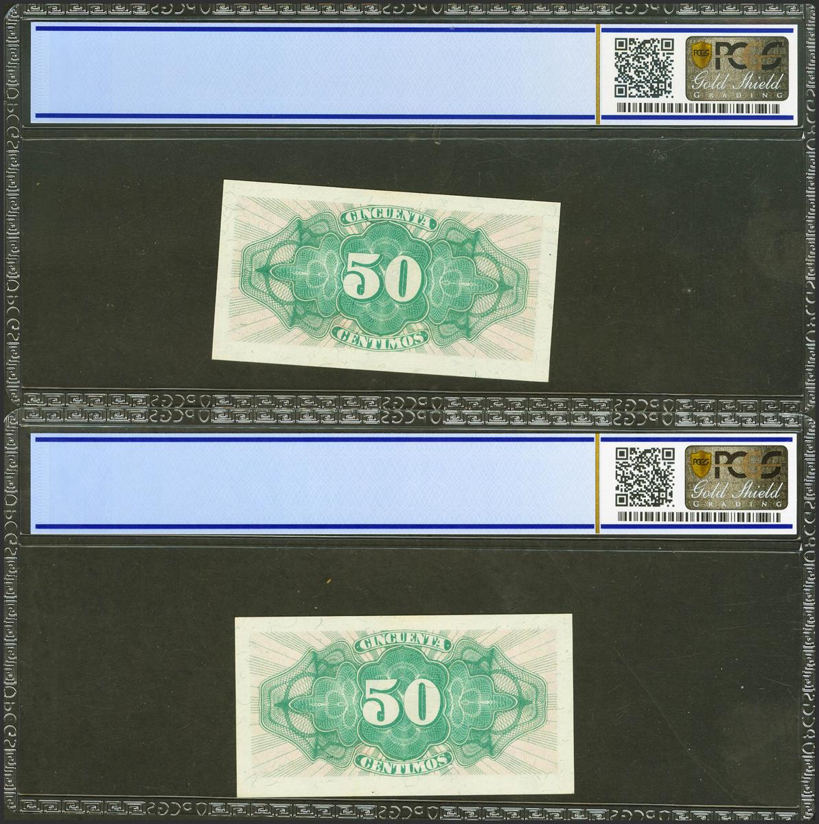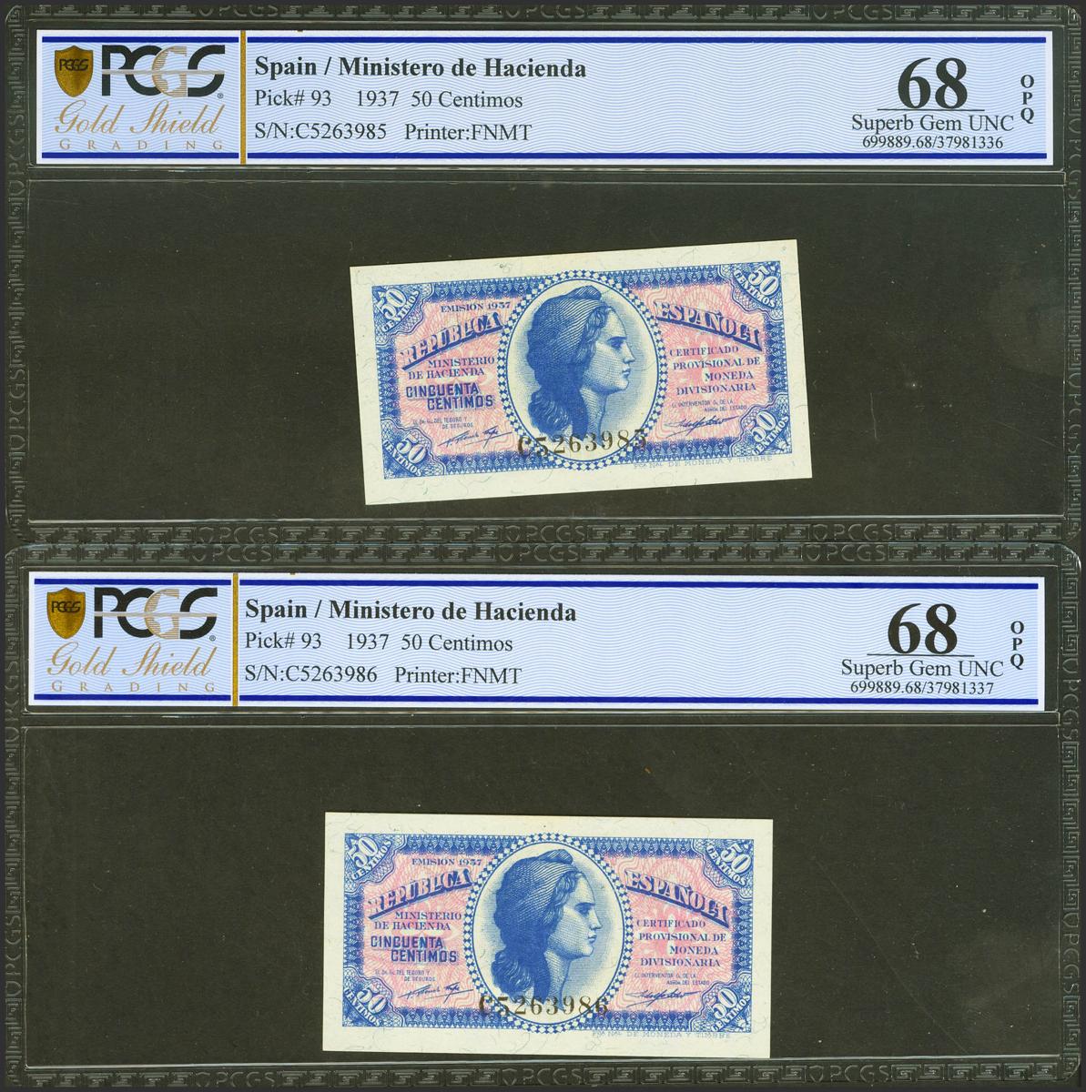 50 Céntimos. 1937. Ministerio de Hacienda. Pareja correlativa. Serie C, última serie emitida. (Edifil 2021: 391a, Pick: 93). Raro en esta excepcional conservación, apresto original. SC. Encapsulado PCGS68OPQ.