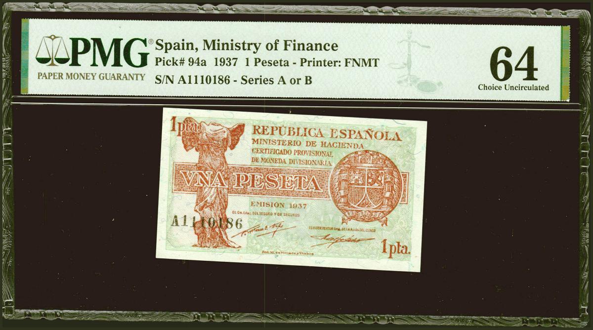 1 Peseta. 1937. Ministerio de Hacienda. Serie A. (Edifil 2021: 392, Pick: 94a). SC. Encapsulado PMG64.