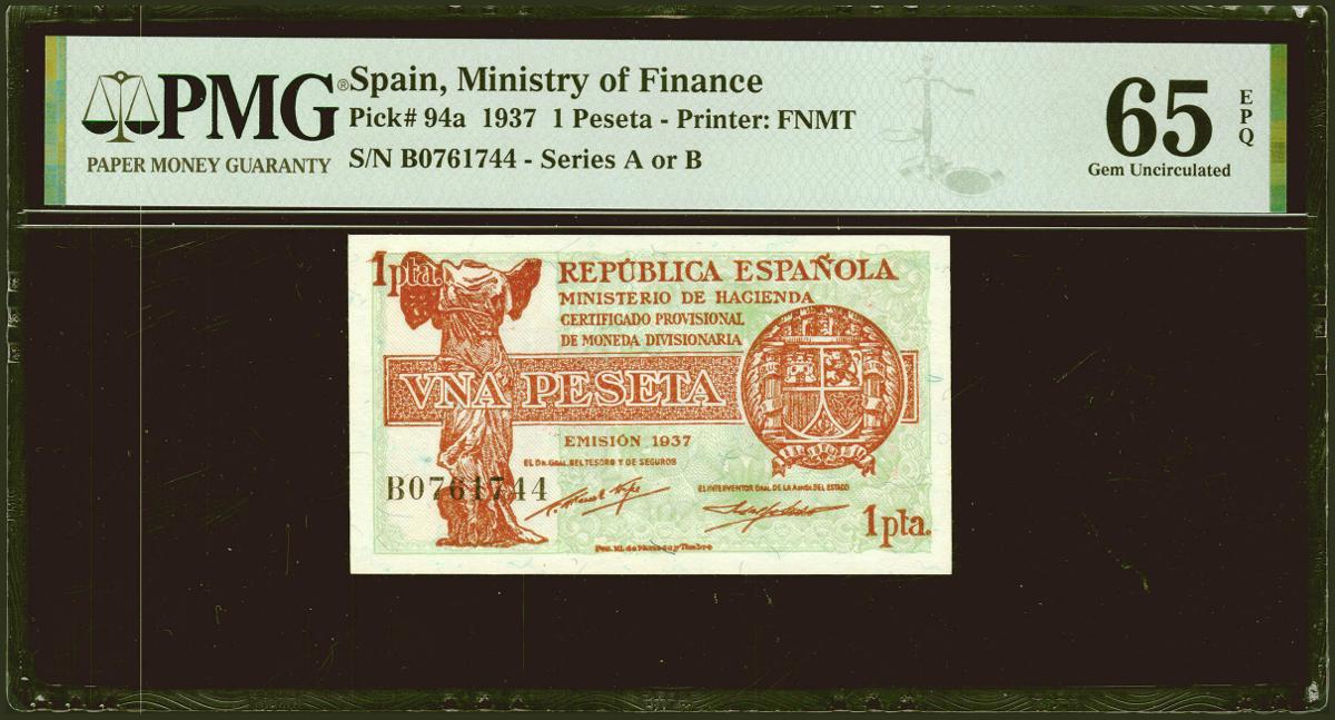 1 Peseta. 1937. Ministerio de Hacienda. Serie B. (Edifil 2021: 392, Pick: 94). Apresto original. SC. Encapsulado PMG65EPQ.