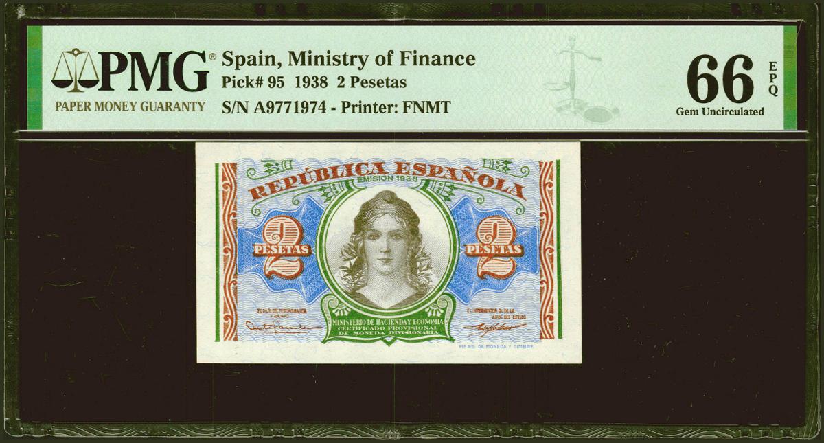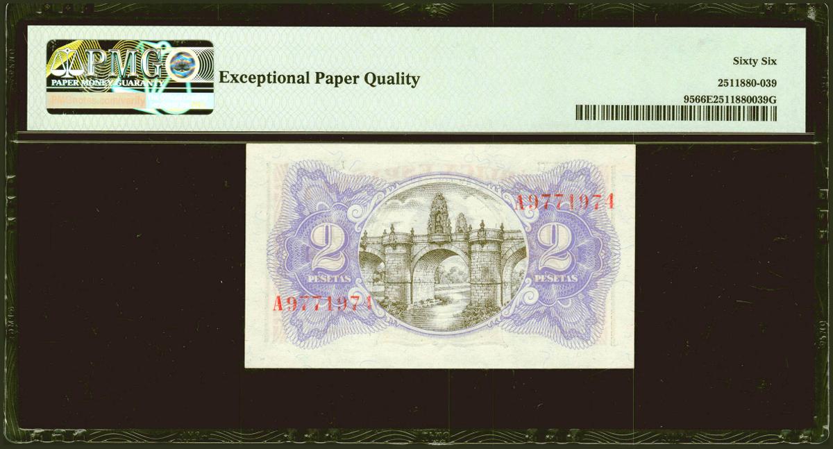 2 Pesetas. 1938. Ministerio de Hacienda. Serie A. (Edifil 2021: 393, Pick: 95). Apresto original. SC. Encapsulado PMG66EPQ.