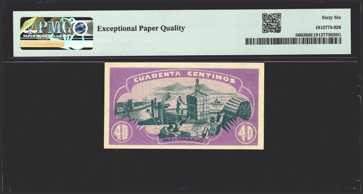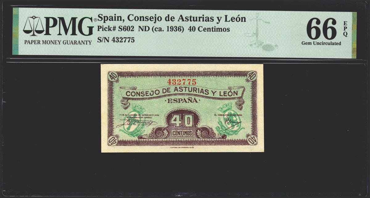 40 Céntimos. 1937. Asturias y León. Sin serie. (Edifil 2021: 395, Pick: S602). Raro en esta excepcional calidad, apresto original. SC. Encapsulado PMG66EPQ. (para hacernos idea de la rareza, a fecha 1 de Abril de 2023, este billete es el segundo mejor calificado junto a otros ocho billetes en PMG)