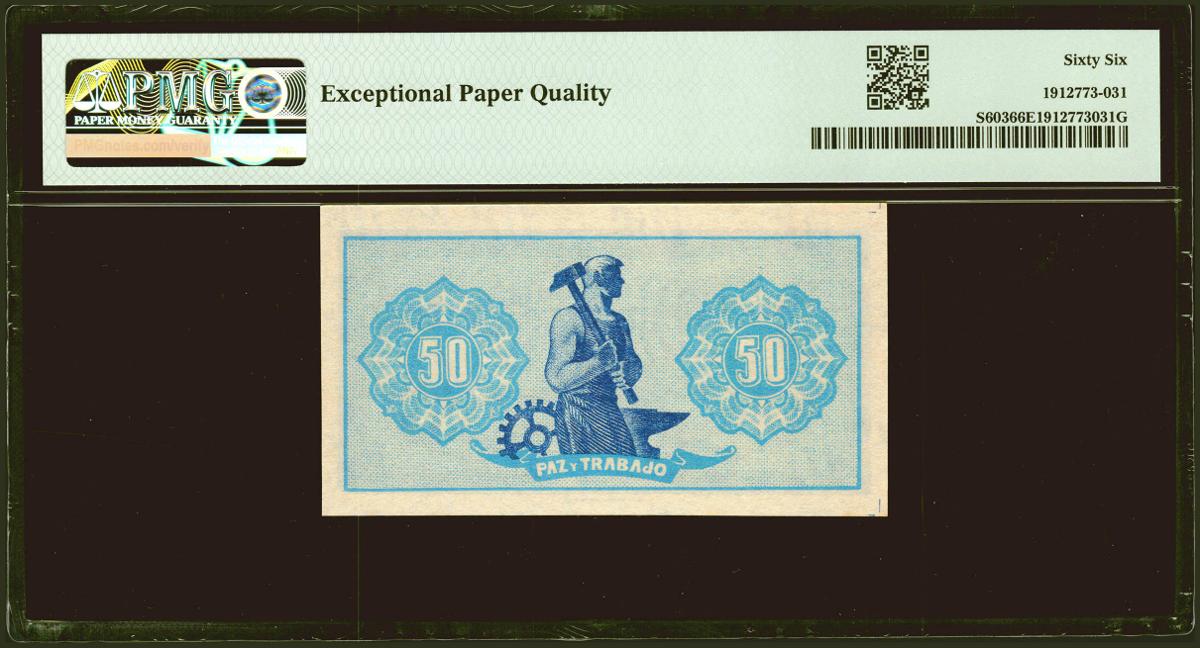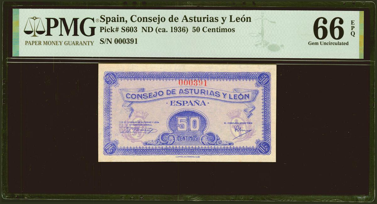 50 Céntimos. 1937. Asturias y León. Sin serie y numeración bajísima. (Edifil 2021: 396, Pick: S603). Rarísimo, especialmente en esta excepcional calidad, apresto original. SC. Encapsulado PMG66EPQ. (para hacernos idea de la rareza, a fecha 1 de Abril de 2023, este billete es el segundo mejor calificado junto a otros cuatro billetes en PMG).