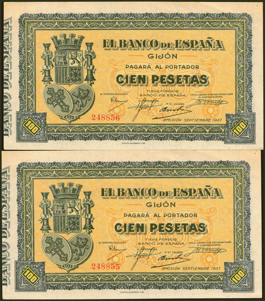 100 Pesetas. Septiembre 1937. Pareja correlativa. Banco de Gijón. Sin serie. (Edifil 2021: 399). Inusual, apresto original. SC--.