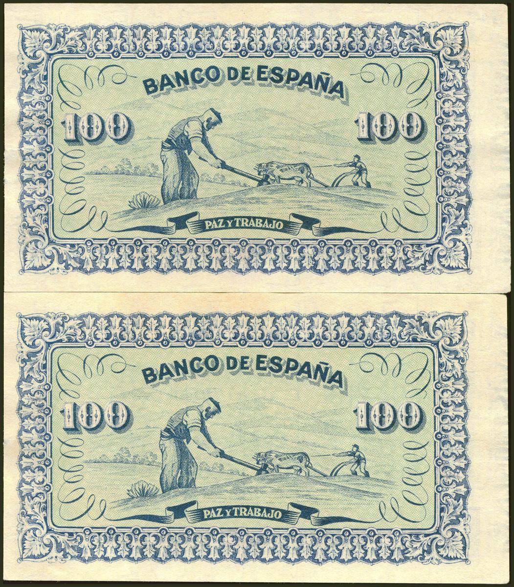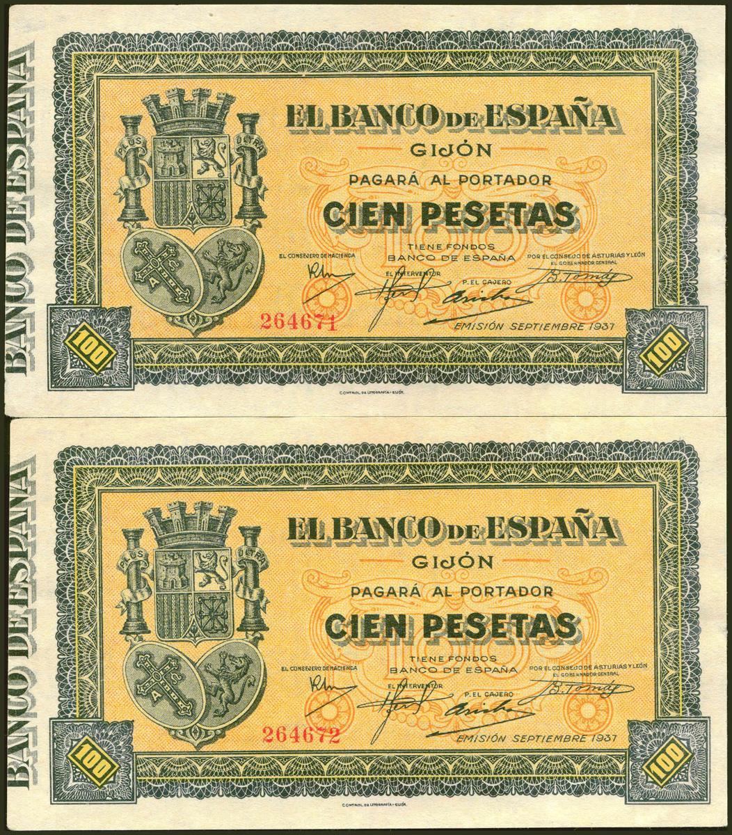 100 Pesetas. Septiembre 1937. Pareja correlativa. Banco de Gijón. Sin serie. (Edifil 2021: 399). Inusual, apresto original. EBC+.