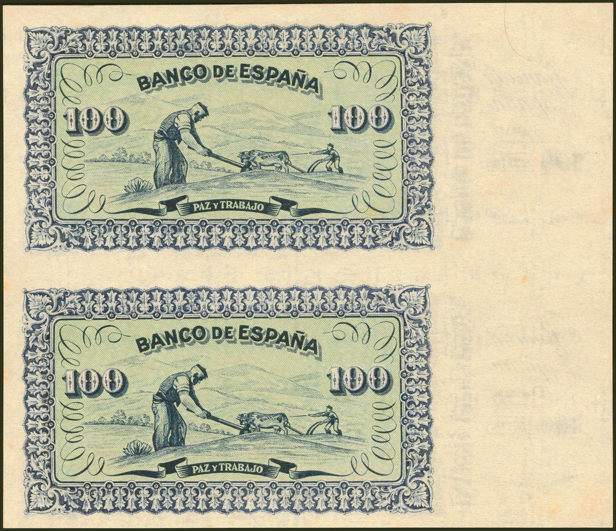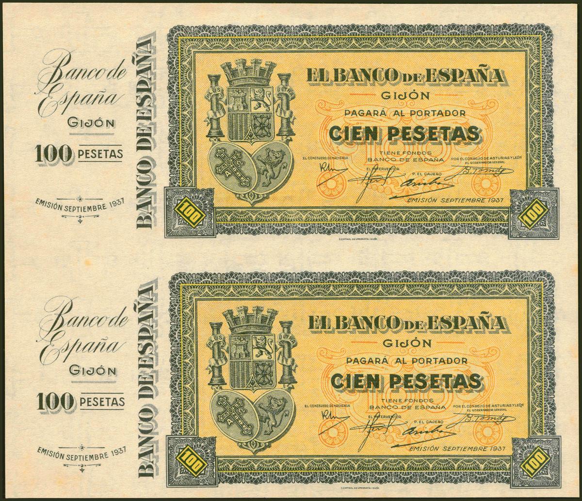 100 Pesetas. Septiembre 1937. Pareja sin guillotinar. Sin serie, sin numeración y con matriz a izquierda. (Edifil 2021: 399a). Rara, apresto original y típicos puntitos sin importancia alguna. SC.