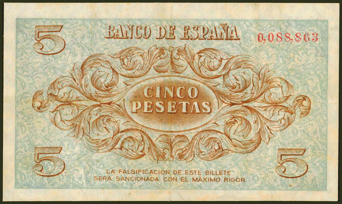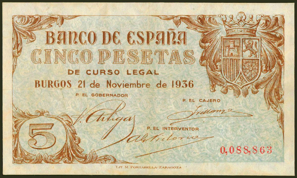 5 Pesetas. 21 de Noviembre de 1936. Sin serie y numeración baja. (Edifil 2021: 417). Inusual, sin reparaciones, conserva algo de su apresto original. MBC.