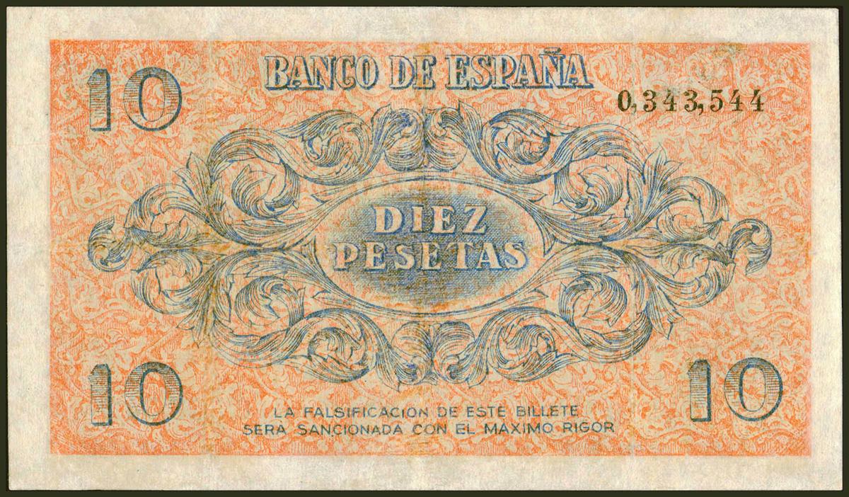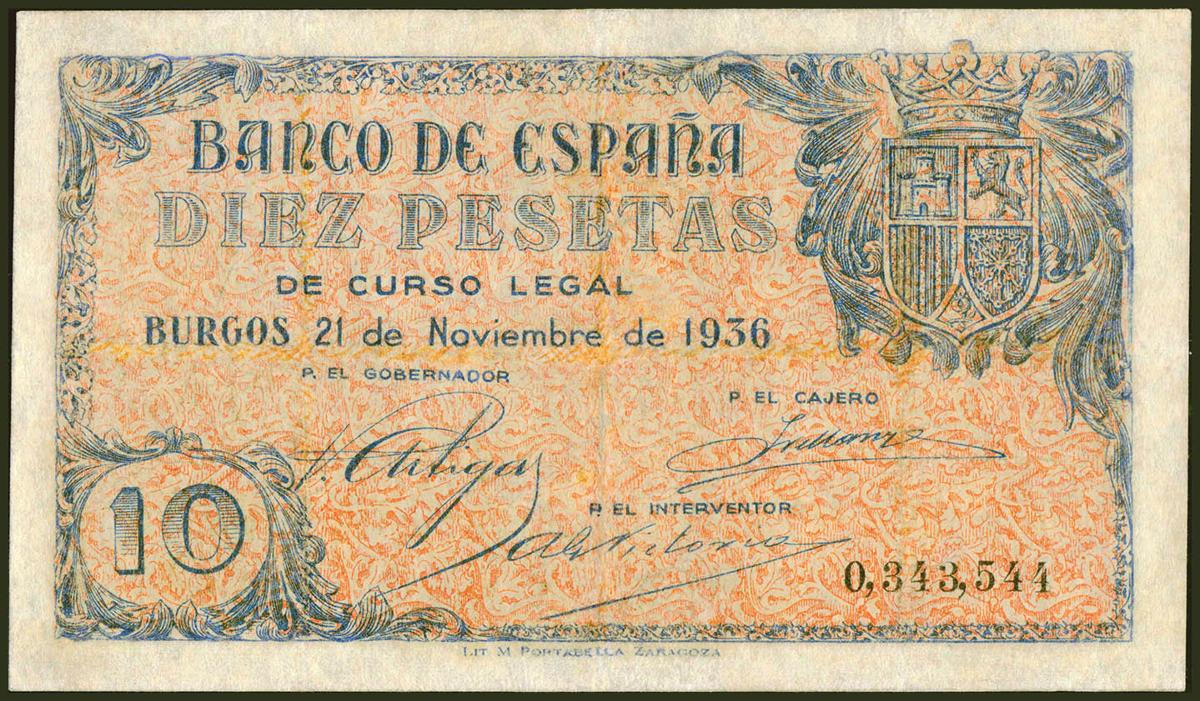 10 Pesetas. 21 de Noviembre de 1936. Sin serie. (Edifil 2021: 418). Inusual, pequeñas reparaciones. MBC-.