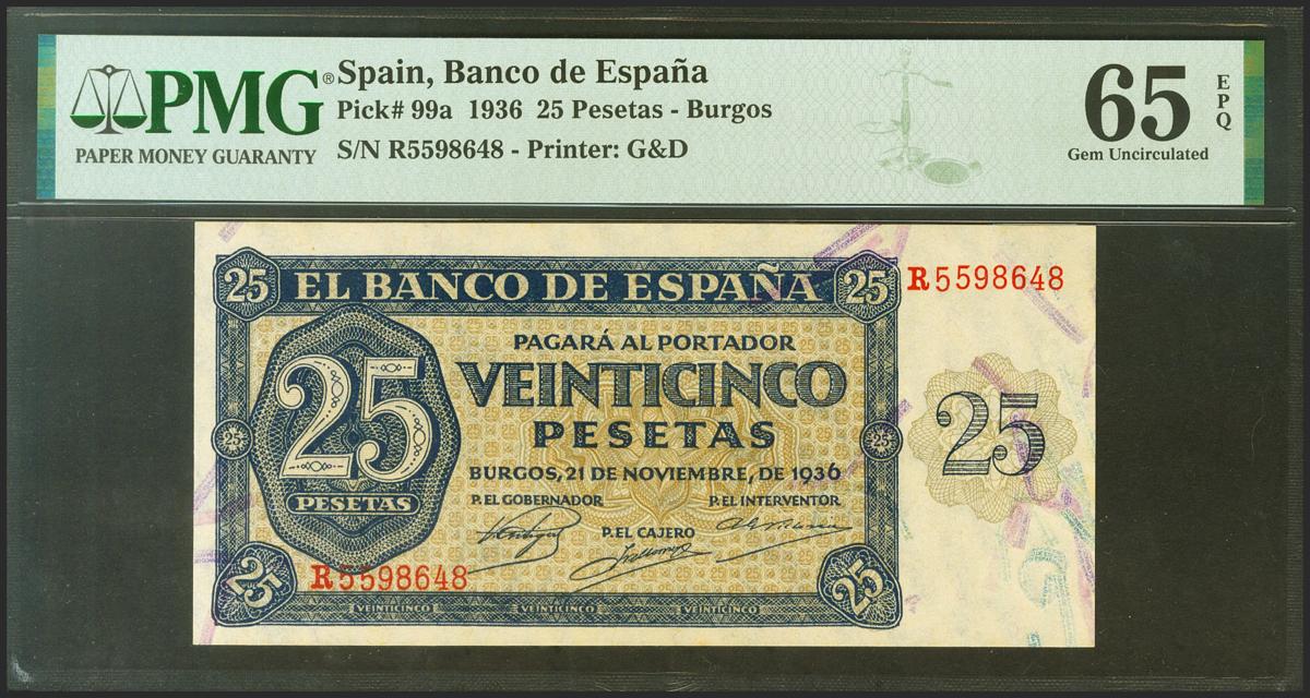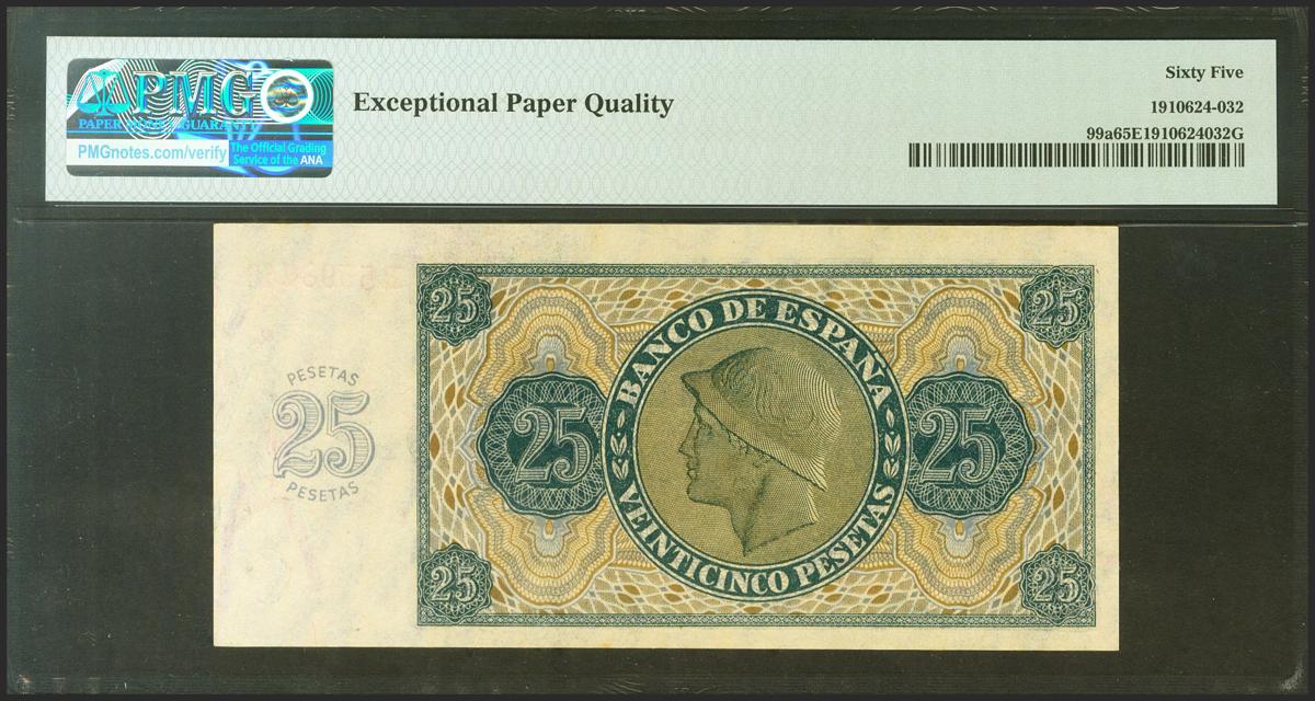25 Pesetas. 21 de Noviembre de 1936. Serie R. (Edifil 2021: 419a, Pick: 99a). Inusual en esta excepcional calidad, apresto original. Encapsulado PMG65EPQ.