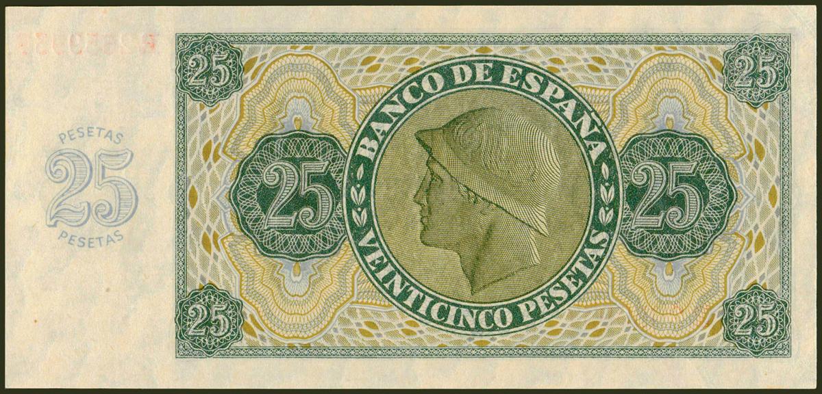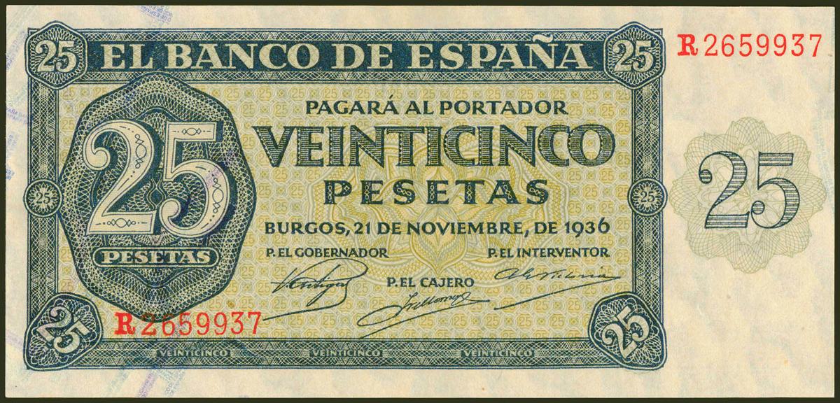 25 Pesetas. 21 de Noviembre de 1936. Serie R. (Edifil 2021: 419a). Conserva todo su apresto original. SC.