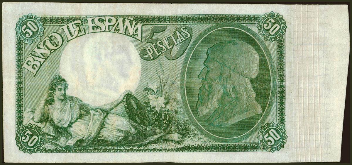 50 Pesetas. 25 de Noviembre de 1899. Serie D. (Edifil 2021: 307a, Pick: 50). Raro en esta conservación, especialmente conservando parte de su apresto original, mínimamente reparado. EBC-.