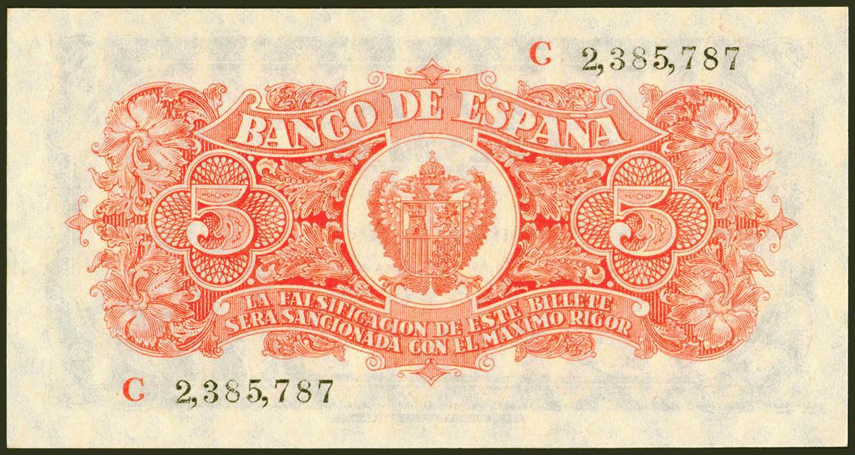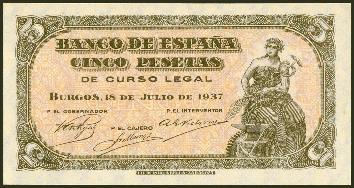 5 Pesetas. 18 de Julio de 1937. Serie C. (Edifil 2021: 424a, Pick: 106a). Muy raro en esta excepcional calidad, apresto original. SC.