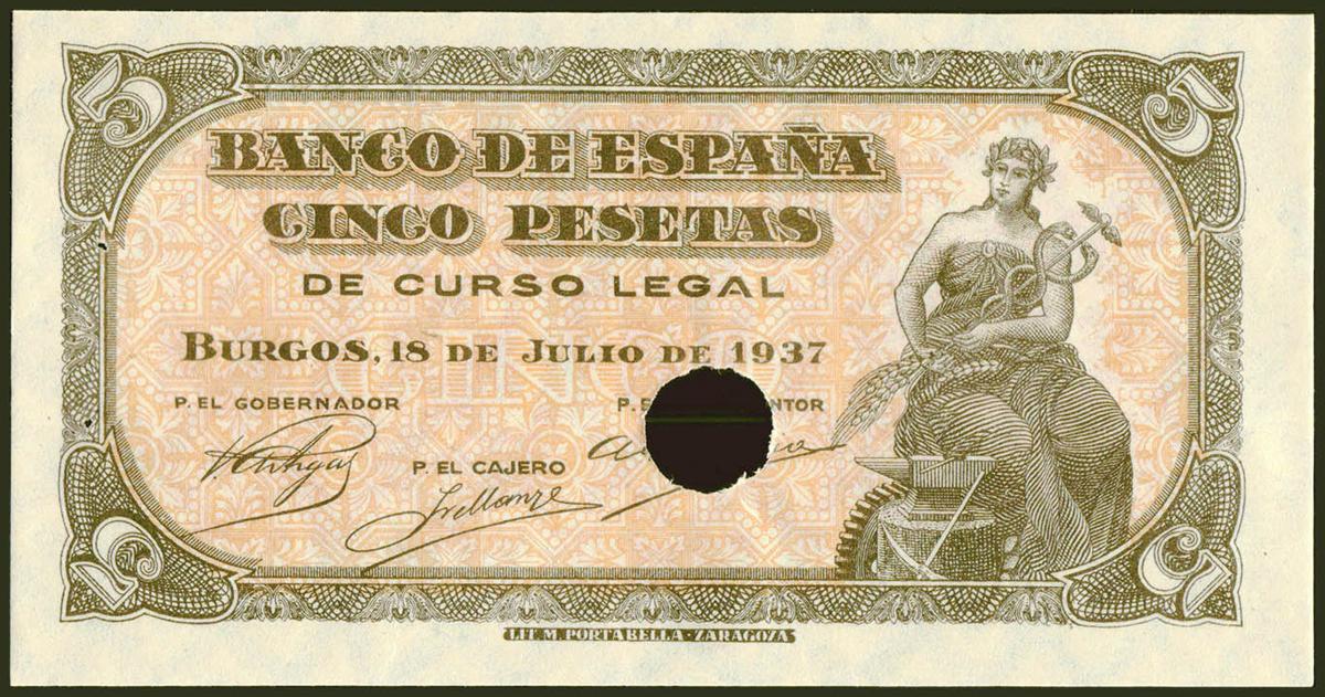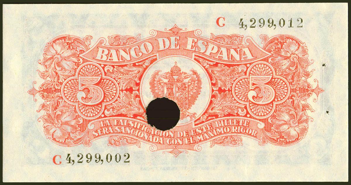 5 Pesetas. 18 de Junio de 1937. Serie C, última serie emitida, sin numeración y taladrado, error en la numeración al dorso que presenta un salto en el dígito de la decena. (Edifil 2021: 424a). Raro, apresto original, puntitos de grapa siempre presentes en los billetes taladrados. SC--.