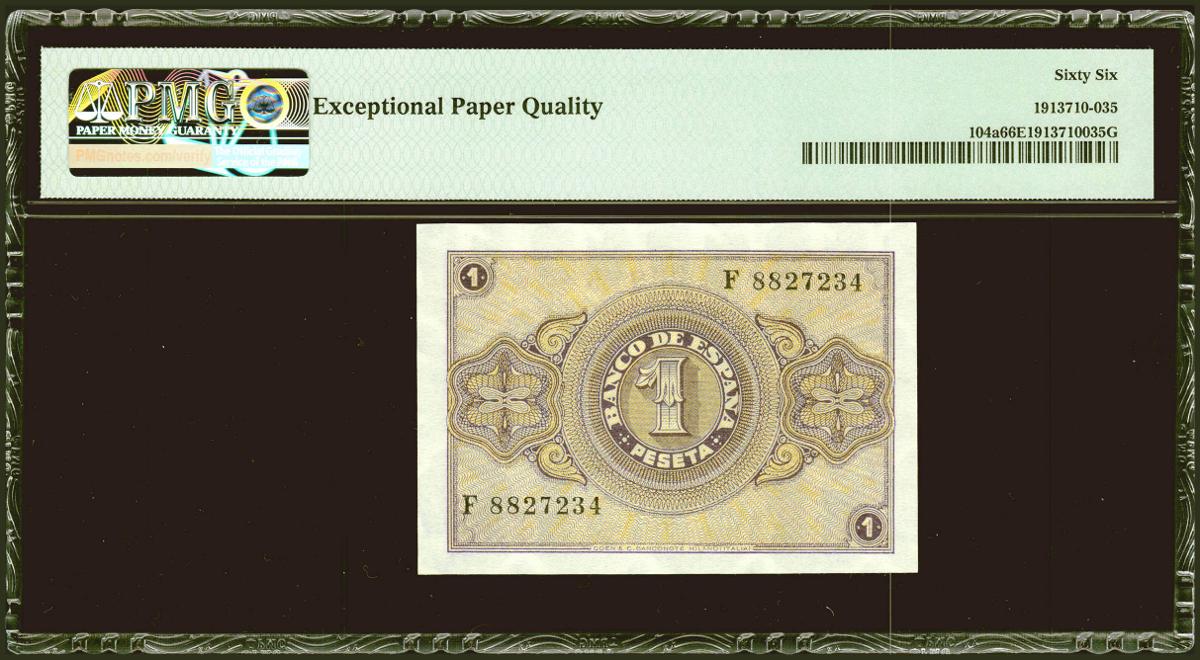 1 Peseta. 12 de Octubre de 1937. Serie F, última serie emitida. (Edifil 2021: 425a, Pick: 104a). Apresto original. SC. Encapsulado PMG66EPQ.