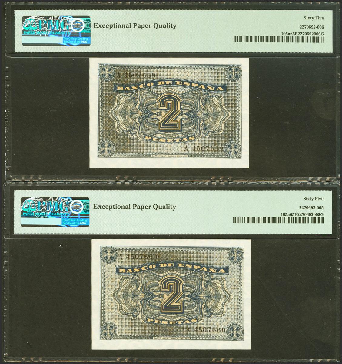 2 Pesetas. 12 de Octubre de 1937. Pareja correlativa. Serie A. (Edifil 2021: 426, Pick: 105a). Inusual en esta excepcional calidad. SC. Encapsulado PMG65EPQ, ambos.