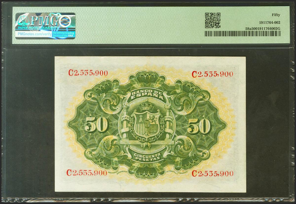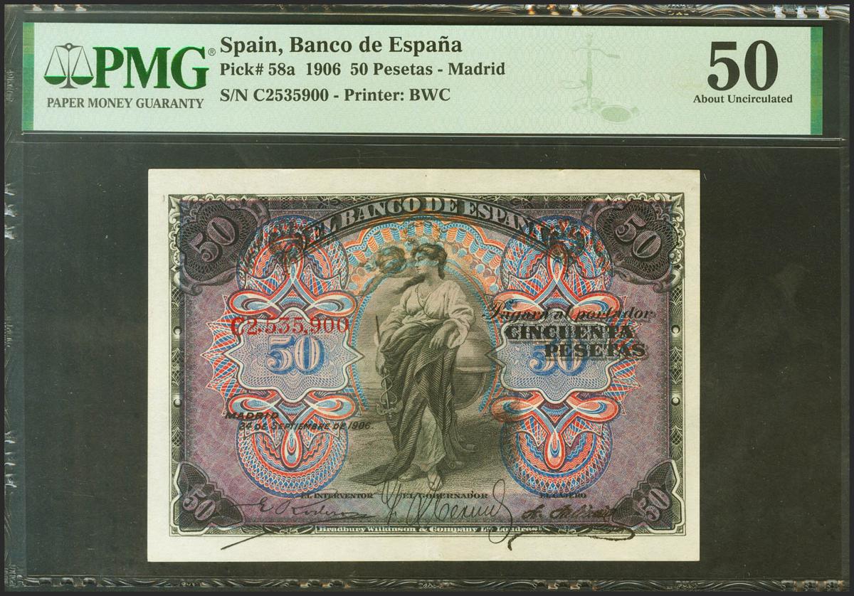 50 Pesetas. 24 de Septiembre de 1906. Serie C, última serie emitida. (Edifil 2017: 315a). EBC. Encapsulado PMG50.