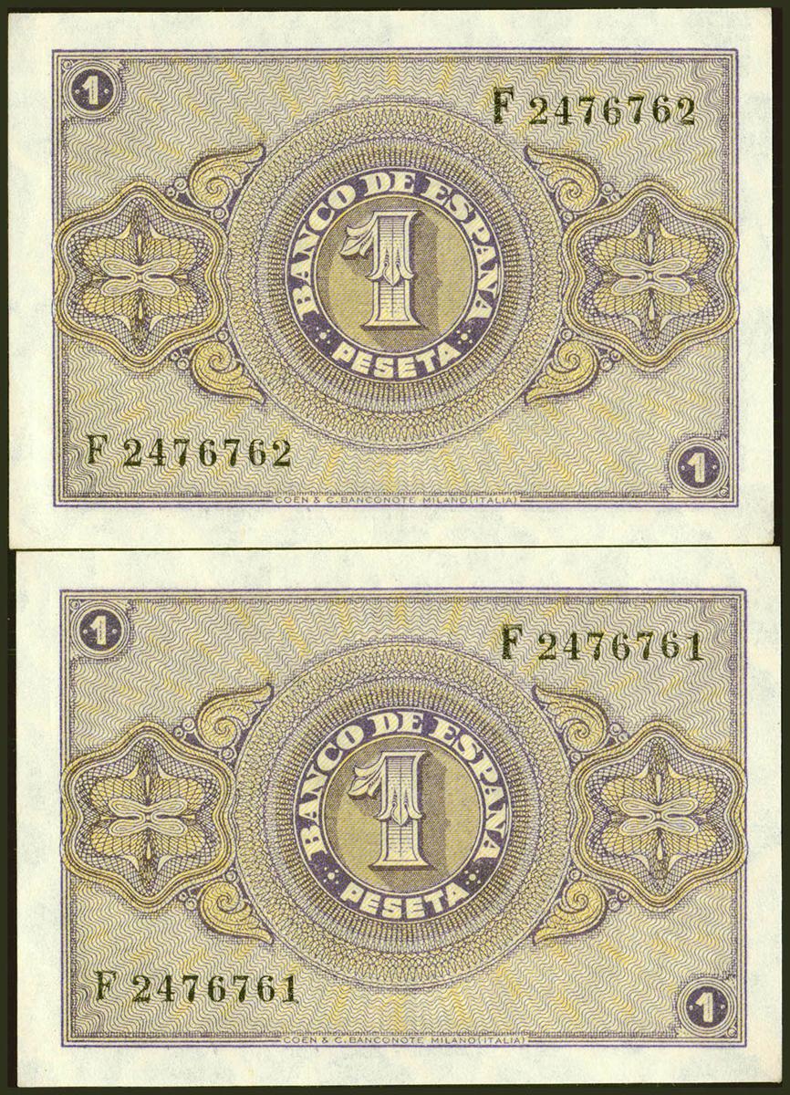 1 Peseta. 30 de Abril de 1938. Pareja correlativa. Serie F. (Edifil 2021: 428a). Conserva todo su apresto original. SC.